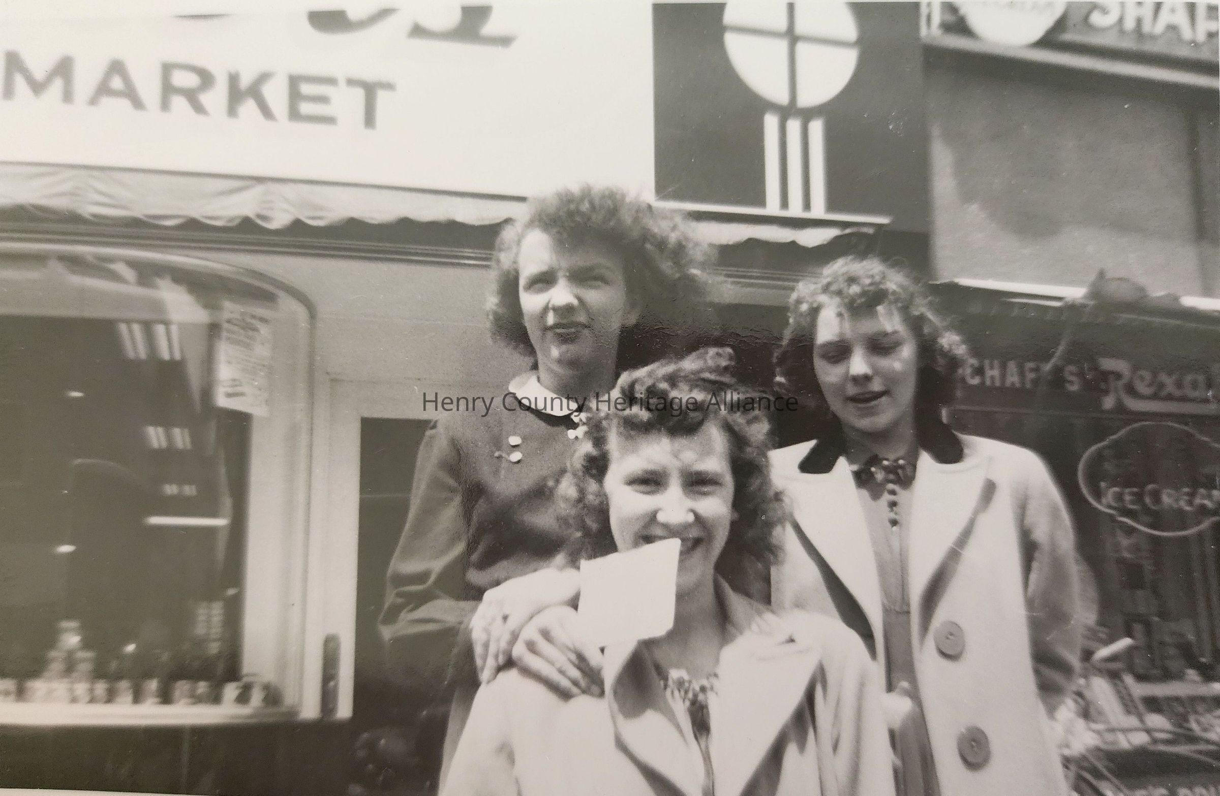 Joanne McColley, Jane Hess & ? in front of Schaff's Rexall Drug Store, Napoleon, Ohio