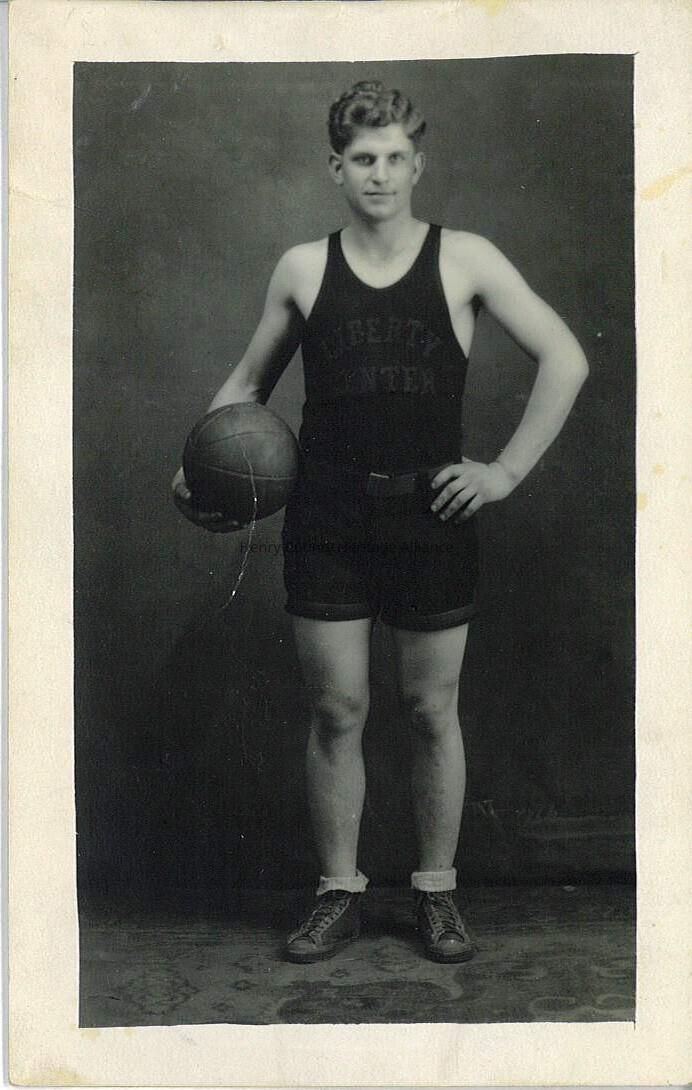 The black and white photograph depicts a young man standing confidently against a plain backdrop while holding a basketball under his left arm, suggesting his involvement in the sport. He is dressed in a vintage basketball uniform consisting of a sleeveless top and shorts, which are black in color with orange lettering, while his athletic shoes are high-tops with visible laces, adding to the overall retro aesthetic. His expression is calm and composed, and his neatly styled hair complements the classic attire, reflecting the style of a bygone era. The man's stance is relaxed yet assertive, with his right hand resting on his hip, exuding a sense of pride and readiness. The photo's edges are slightly worn, indicating its age, lending the image a historical charm that captures a moment in sports culture's past, preserving the essence of early 20th-century athletic fashion and spirit.