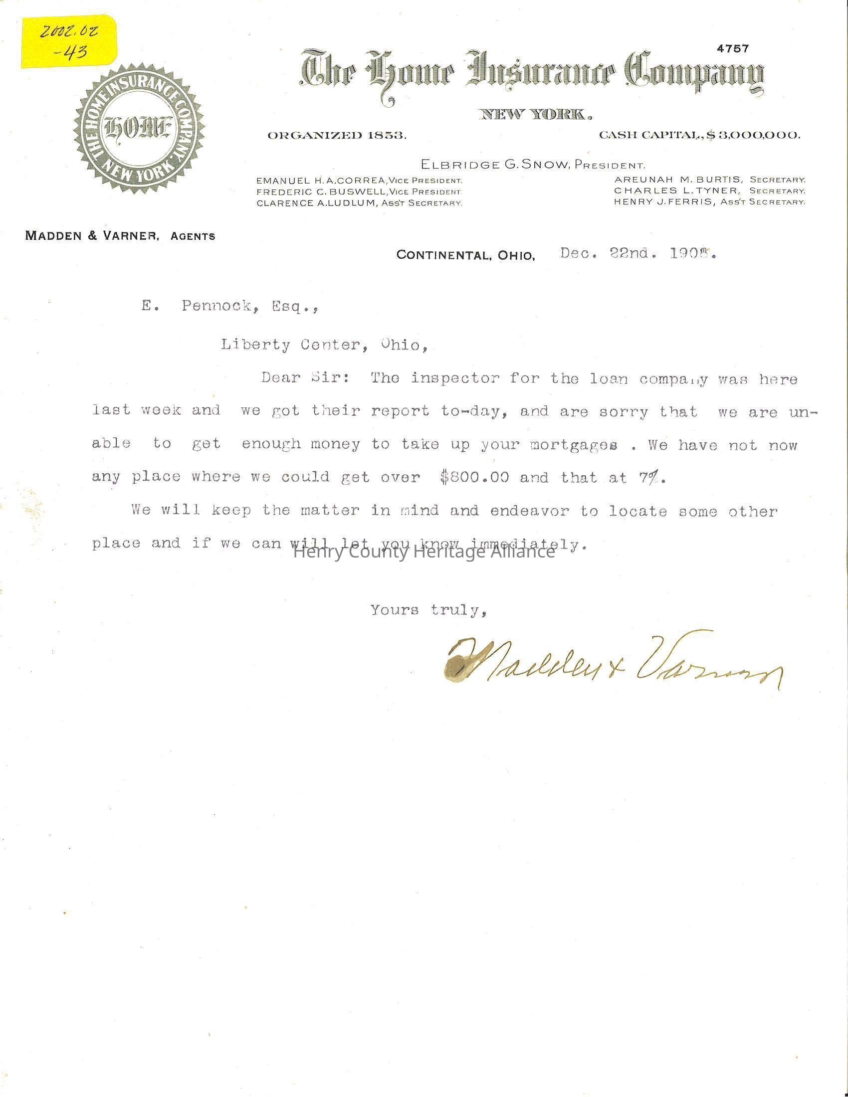 Letter from Home Insurance Company to Edmond Pennock