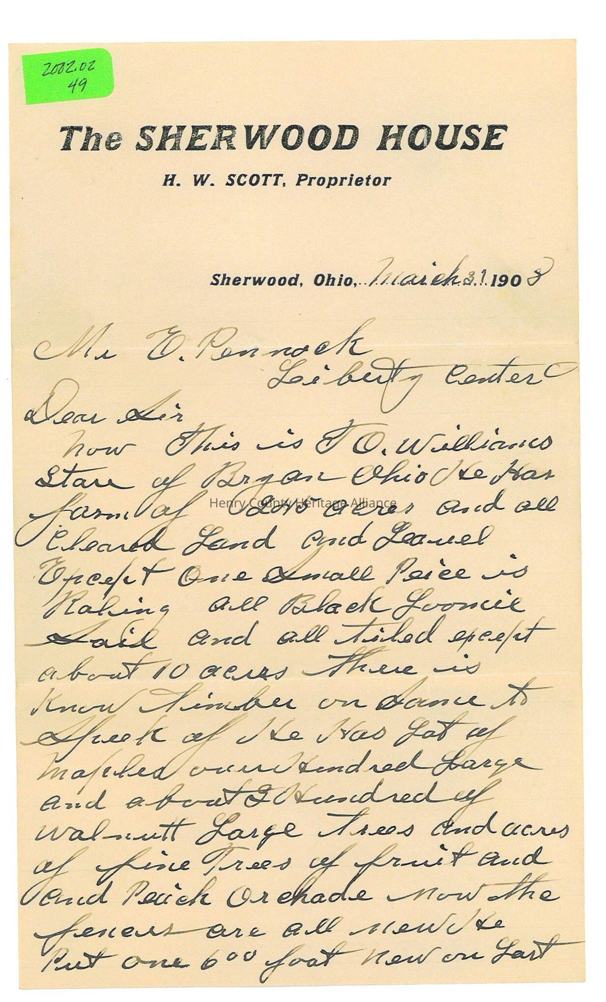 Letter to Edmond Pennock from The Sherwood House of Sherwood, Ohio