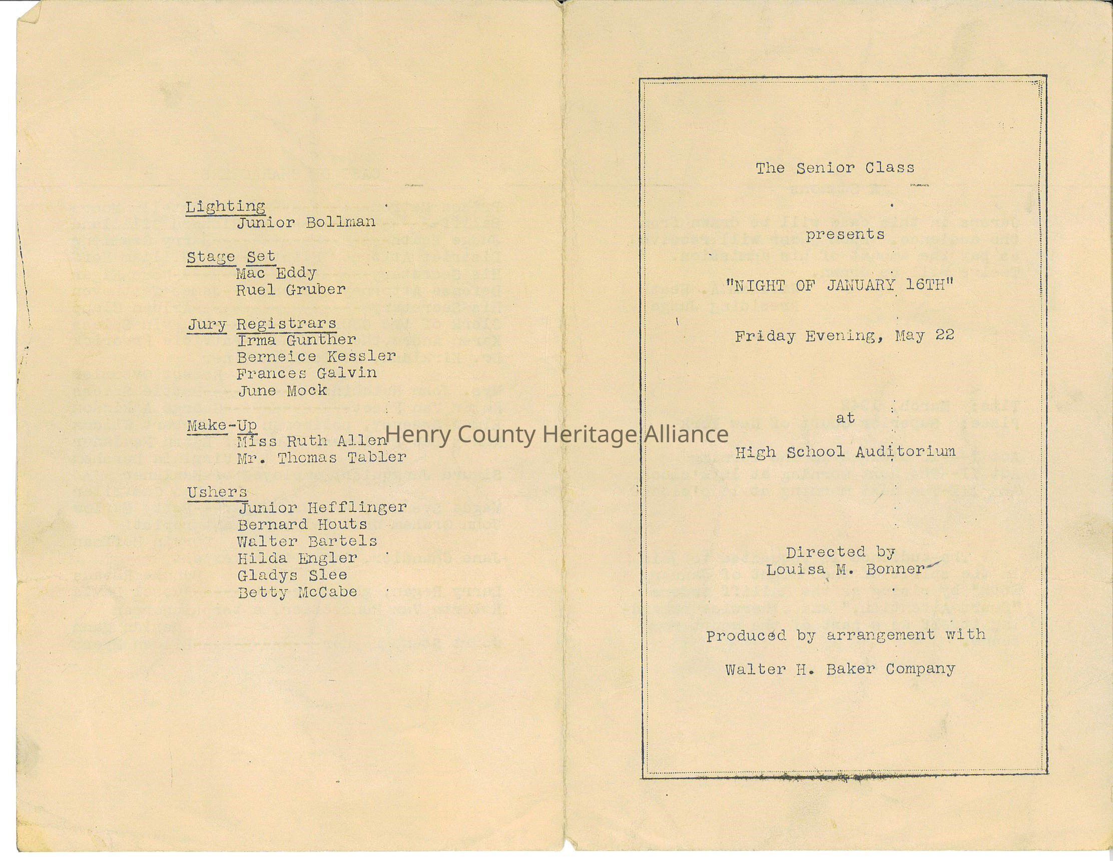 Liberty Center High School Senior Play Program "Night of January 16th" Play given on May 22 but not year given.Collection