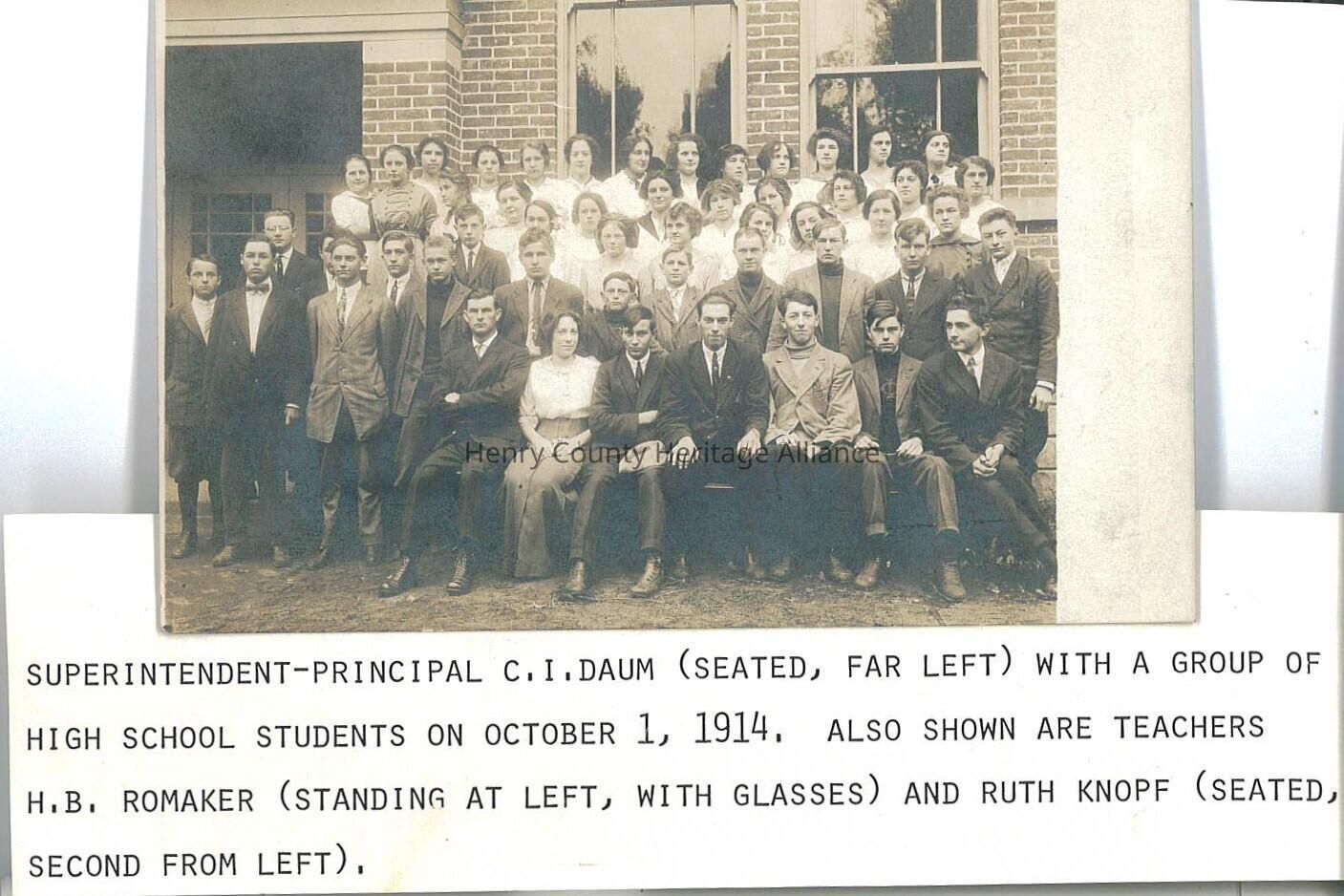 Superintendent Principal C.I. Daum (seated far left) with a group of Liberty Center High School Students. Also shown are teachers H.B. Romaker (standing left with glasses) and Ruth Knopt (seated second from left).Collection