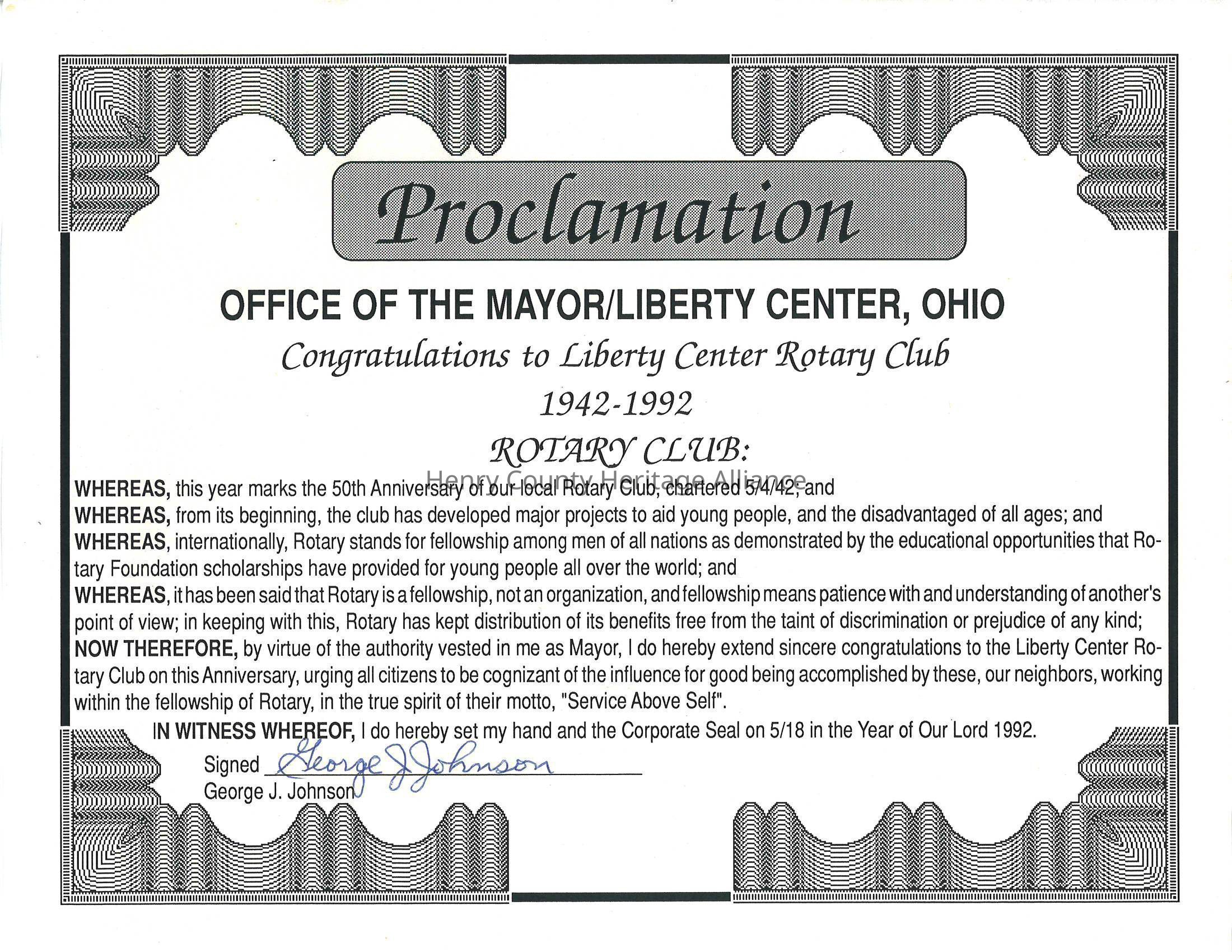 Liberty Center Rotary Club Proclamation from Mayor George Johnson, 1942-1992