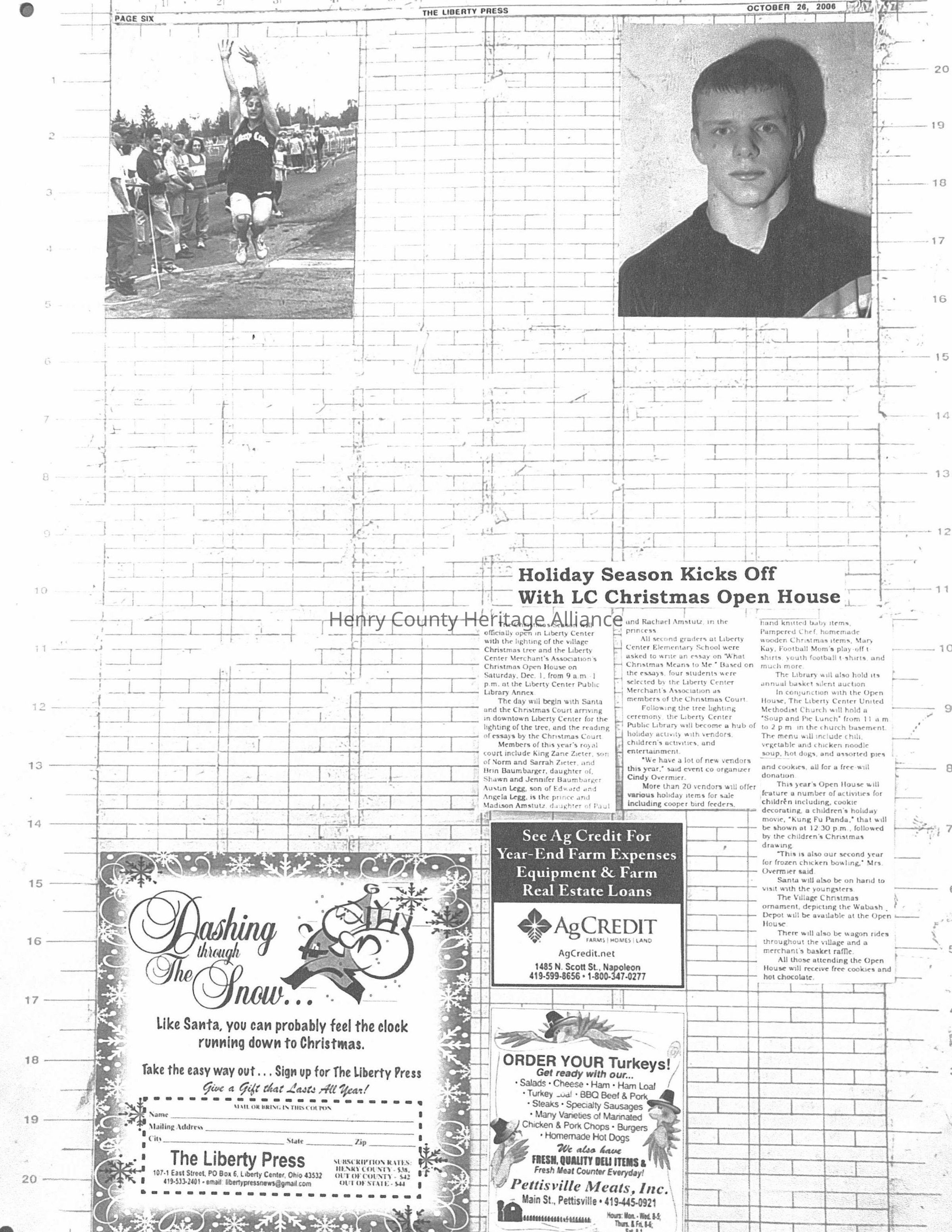 The image is a scanned page from "The Liberty Press," dated October 26, 2006, showing two photographs at the top—one of an athlete mid-jump during a track event and the other of a young man against a plain background. Below the images, an article titled "Holiday Season Kicks Off With LC Christmas Open House" details various Christmas events, including performances by the Liberty Center Preschool and the Varsity Chorale. Additionally, several advertisements are present on the page.