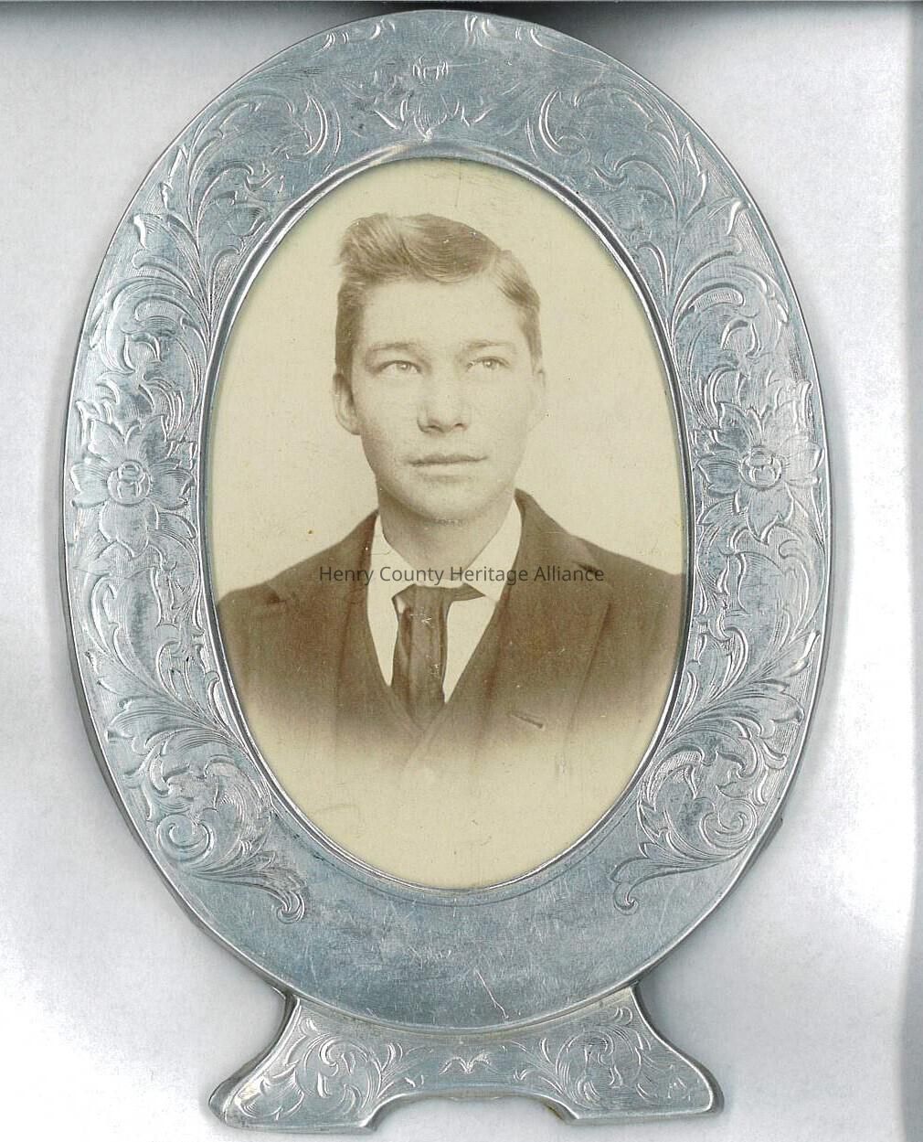 The image displays a sepia-toned photograph of a Melvin Clifford Young in a suit and tie, captured in an oval frame adorned with intricate floral and swirling engravings, suggesting a timeless and elegant aesthetic, indicative of late 19th to early 20th-century portraiture, highlighting the person's poised and contemplative expression which adds a layer of mystery and intrigue to the composition, while the silver frame further complements the classic charm and sophistication of the photograph, emphasizing the detailed craftsmanship of that era's design.