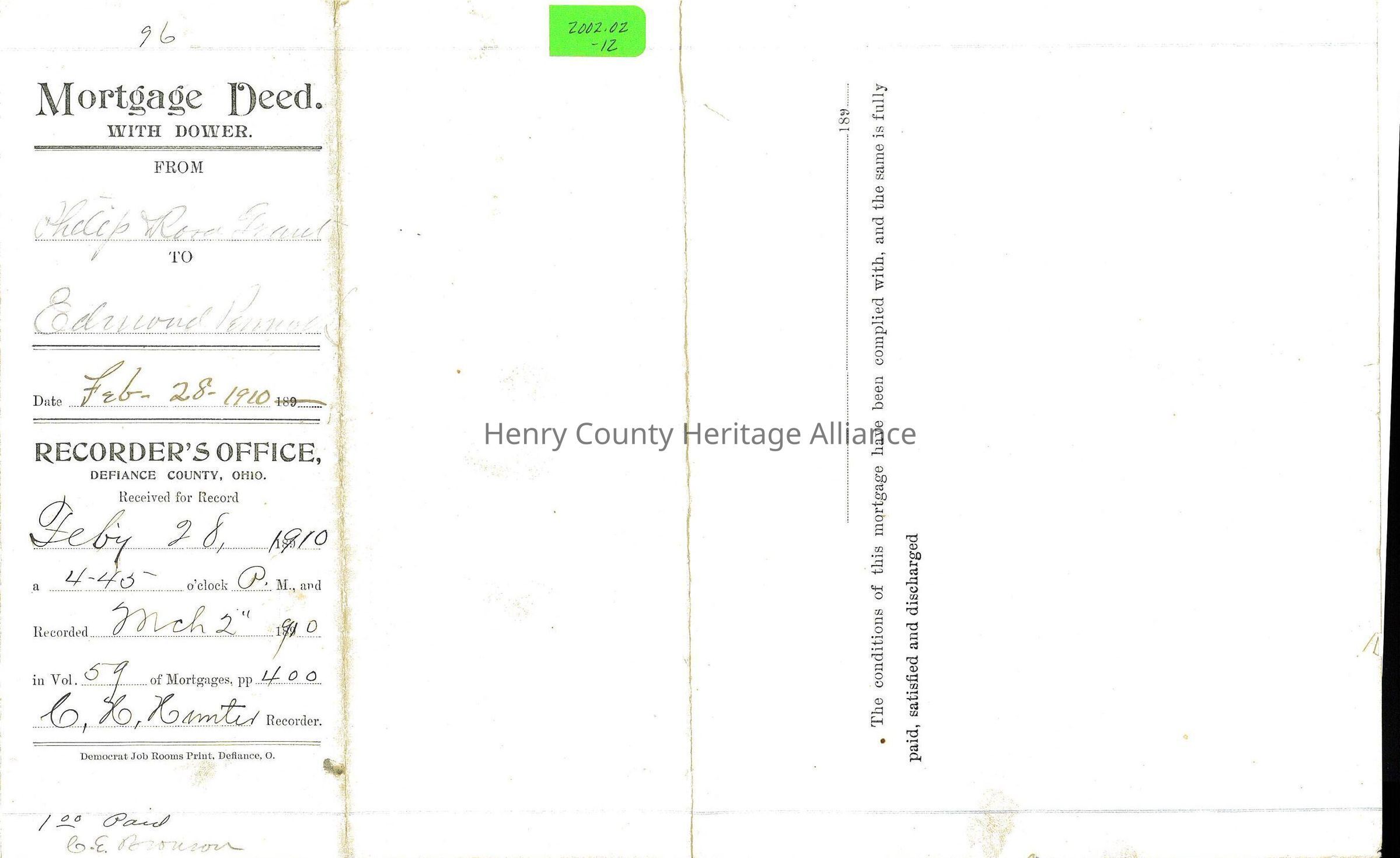 Mortgage Deed of Edmund Pennock in Defiance County, OH