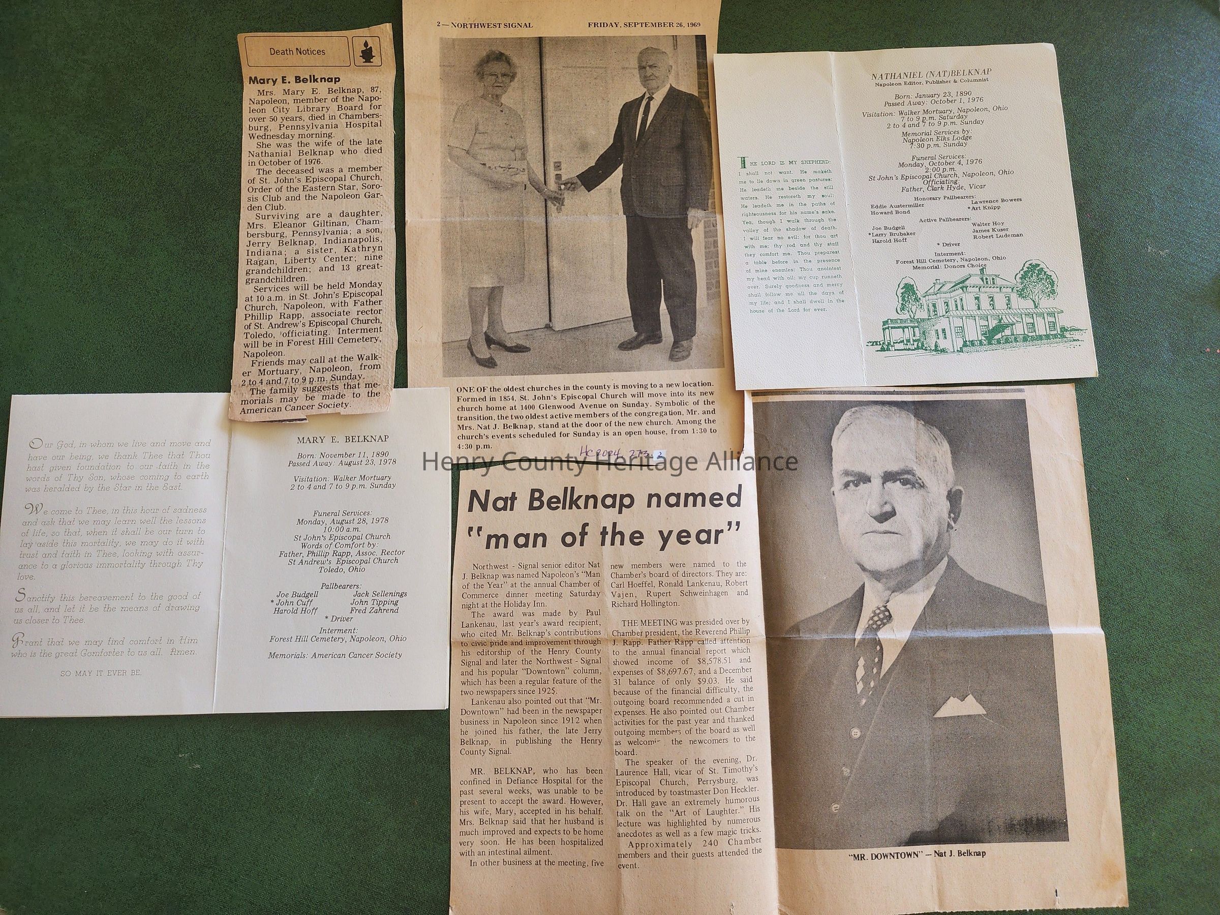 Mr. & Mrs. Nate Belknap, Obituaries, Chamber of Commerce Man of the Year, Introducing St John Episcopal Church at 1400 Glenwood. Clippings