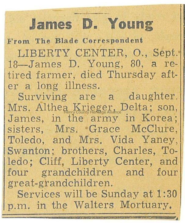 Newspaper Clipping of James D. Young Obituary From The Blade Correspondent