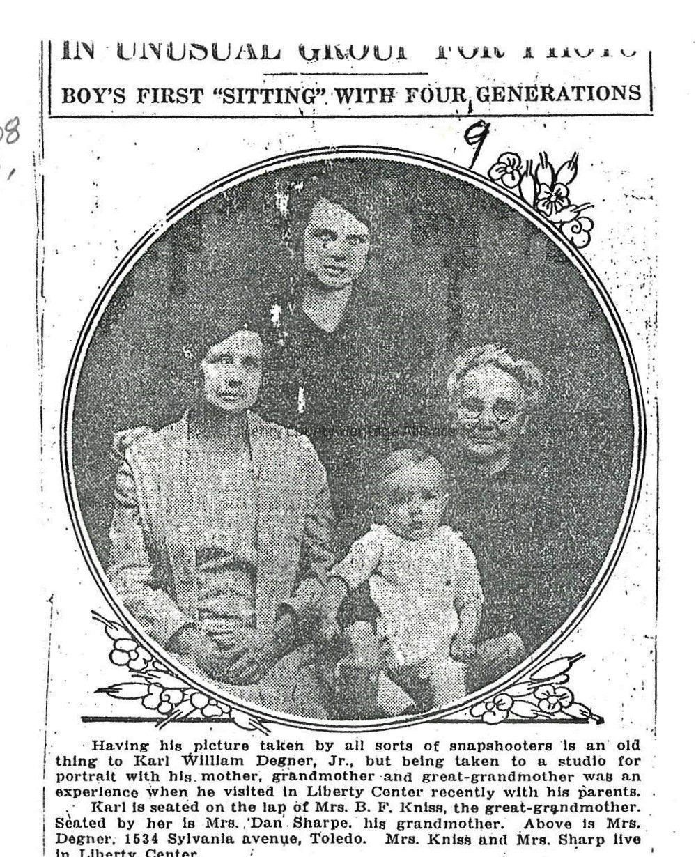 Newspaper Clipping of Karl William Degner, Jr. with Mother Mrs. Karl Degner, Grandmother Mrs. Dan Sharpe; and Great-Grandmother Mrs. B. F. KnissCollection