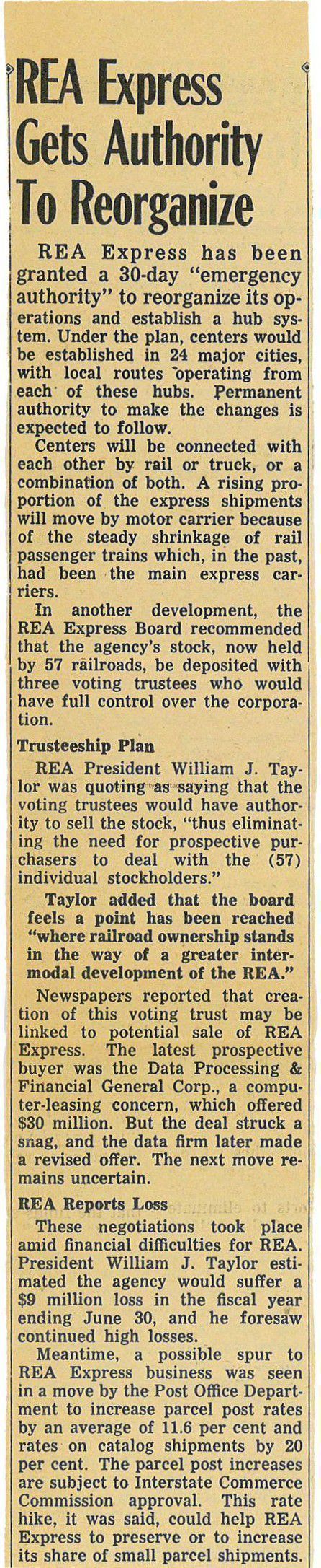 Newspaper Clipping on REA Express Reorganization 1970