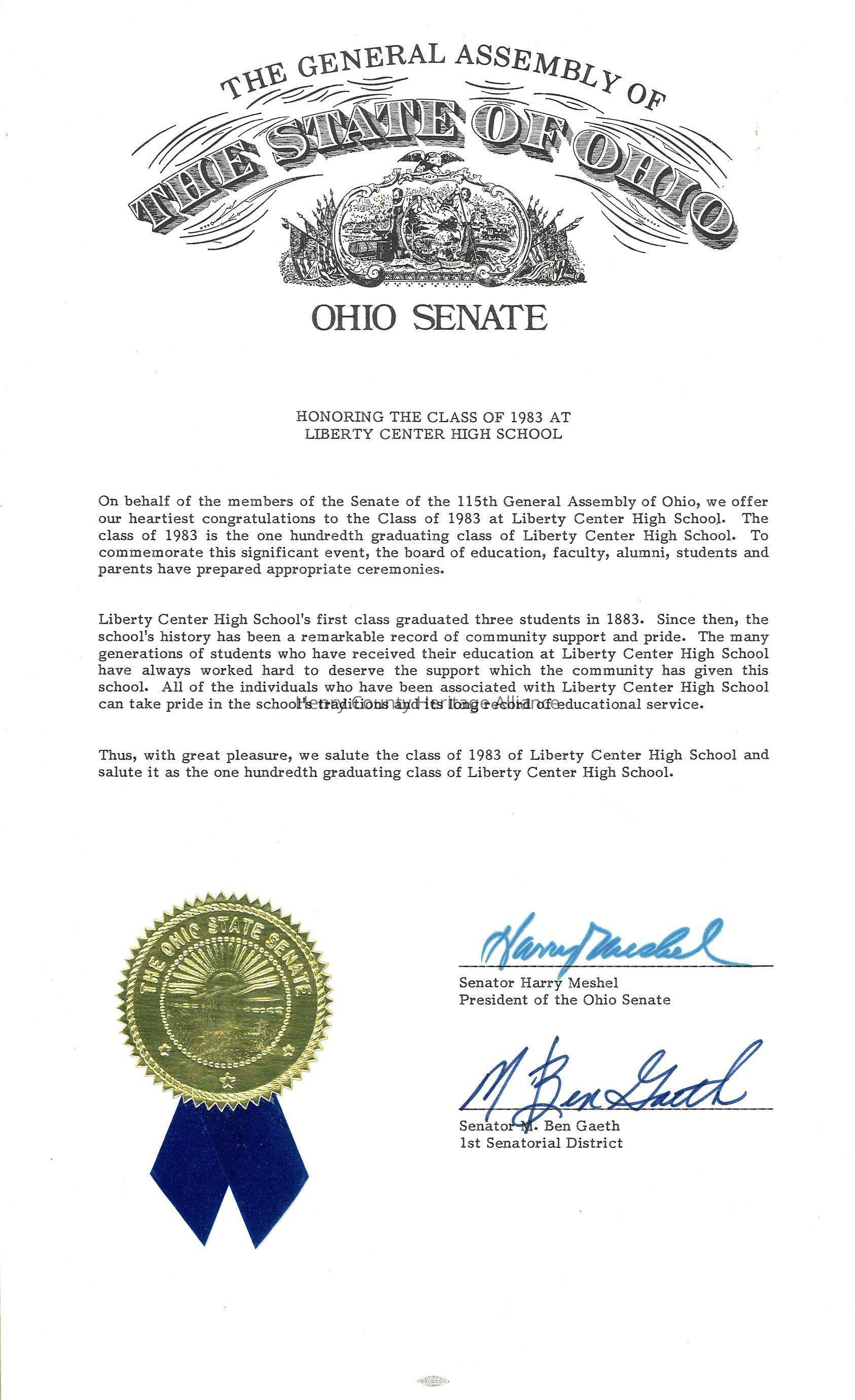 Ohio Senate Citation for Liberty Center High School's 100th year 1983 ClassScope and Content
