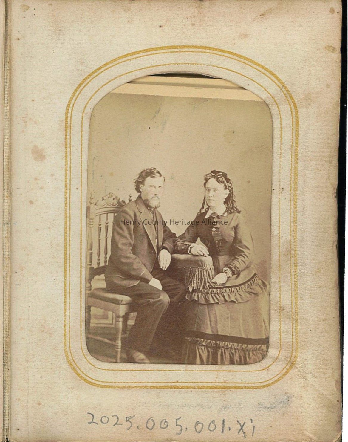 A man and woman from the past are posing formally for a photographic portrait in an ornate frame.