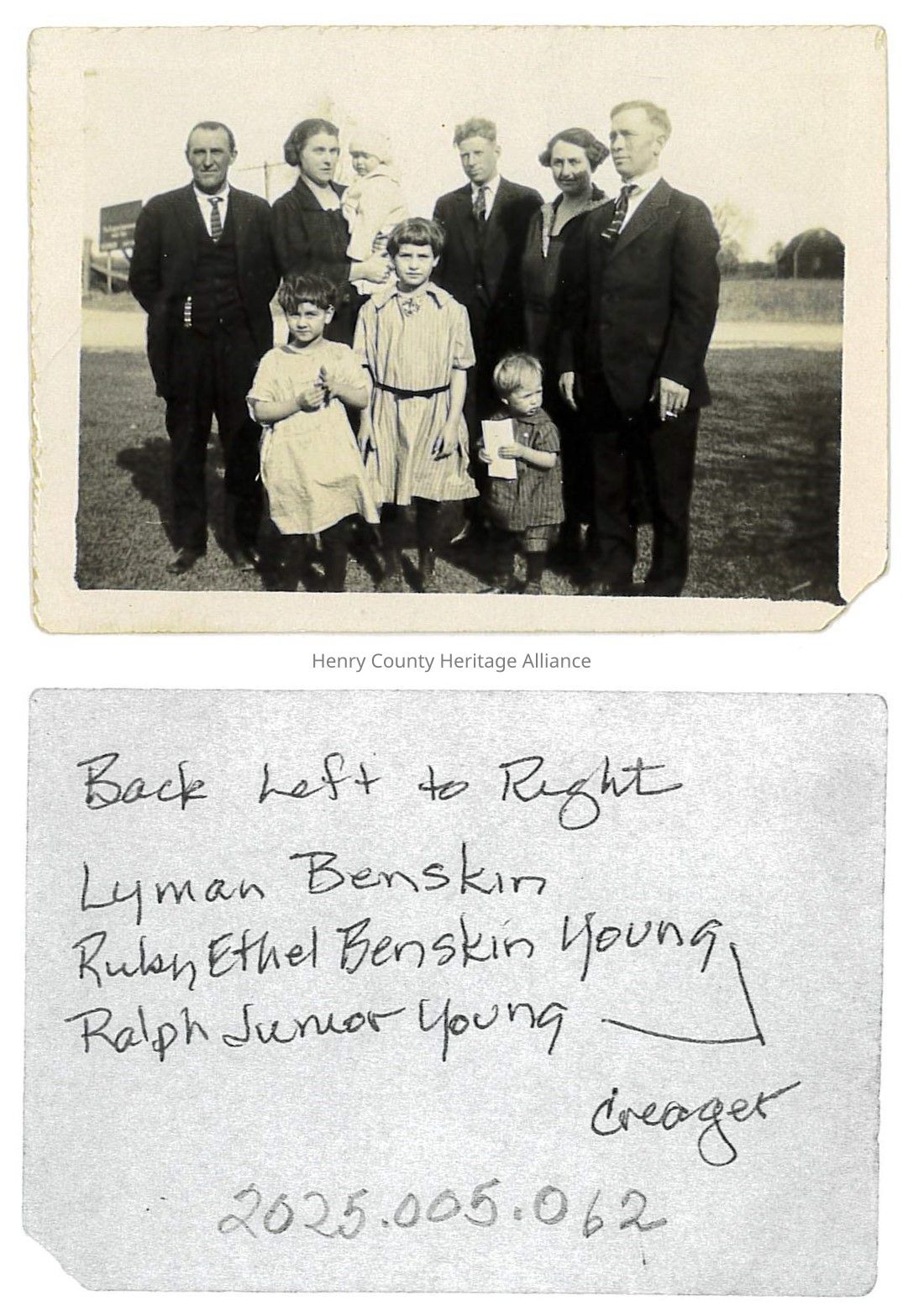 Photo of Family Members (Back Left to Right) Lyman Benskin, Ruby Ethel Benskin Creager and Ralph Junior Young and Eight Un-Named PersonsssDescription