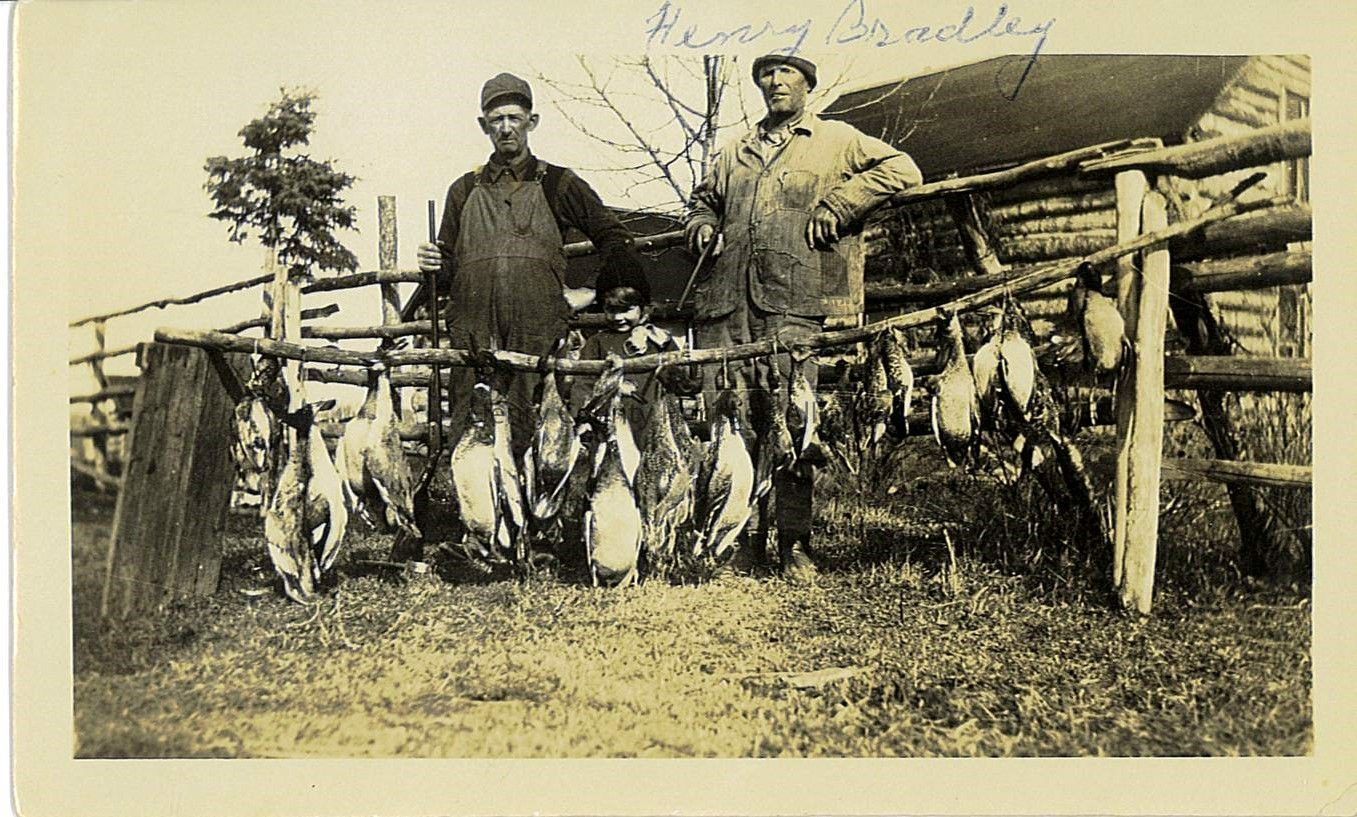 In the image, two men dressed in early 20th-century outdoor attire stand proudly beside a rustic wooden fence, displaying a successful hunting trip with numerous birds hanging in a neat row; a child, partially obscured, is positioned between them, adding a sense of family involvement to the hunting scene.