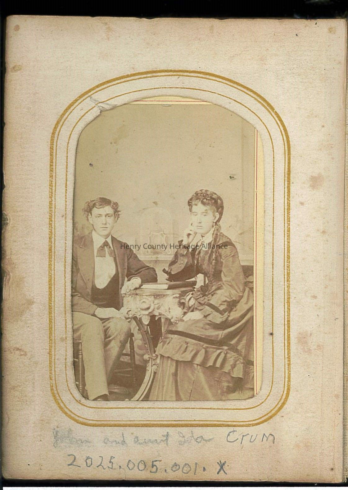 The sepia-toned photograph depicts a man and a woman from a bygone era, seated together in a formal pose; the man, dressed in a suit with a vest and bow tie, rests his hand on a beautifully ornate table, while the woman, adorned in an elegant long dress with intricate details and a high collar, rests her elbow on the table, contemplating thoughtfully; the intricately carved furniture and the formal pose suggest a studio setting from the late 19th or early 20th Century.
