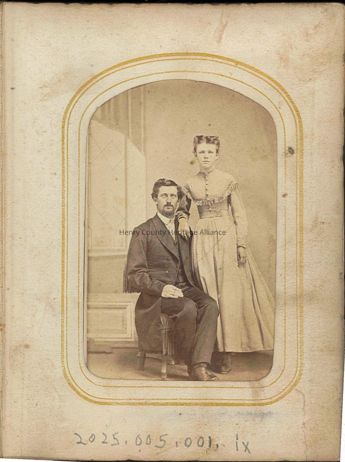 A vintage photograph shows a man seated, with a woman standing beside him, in period attire.