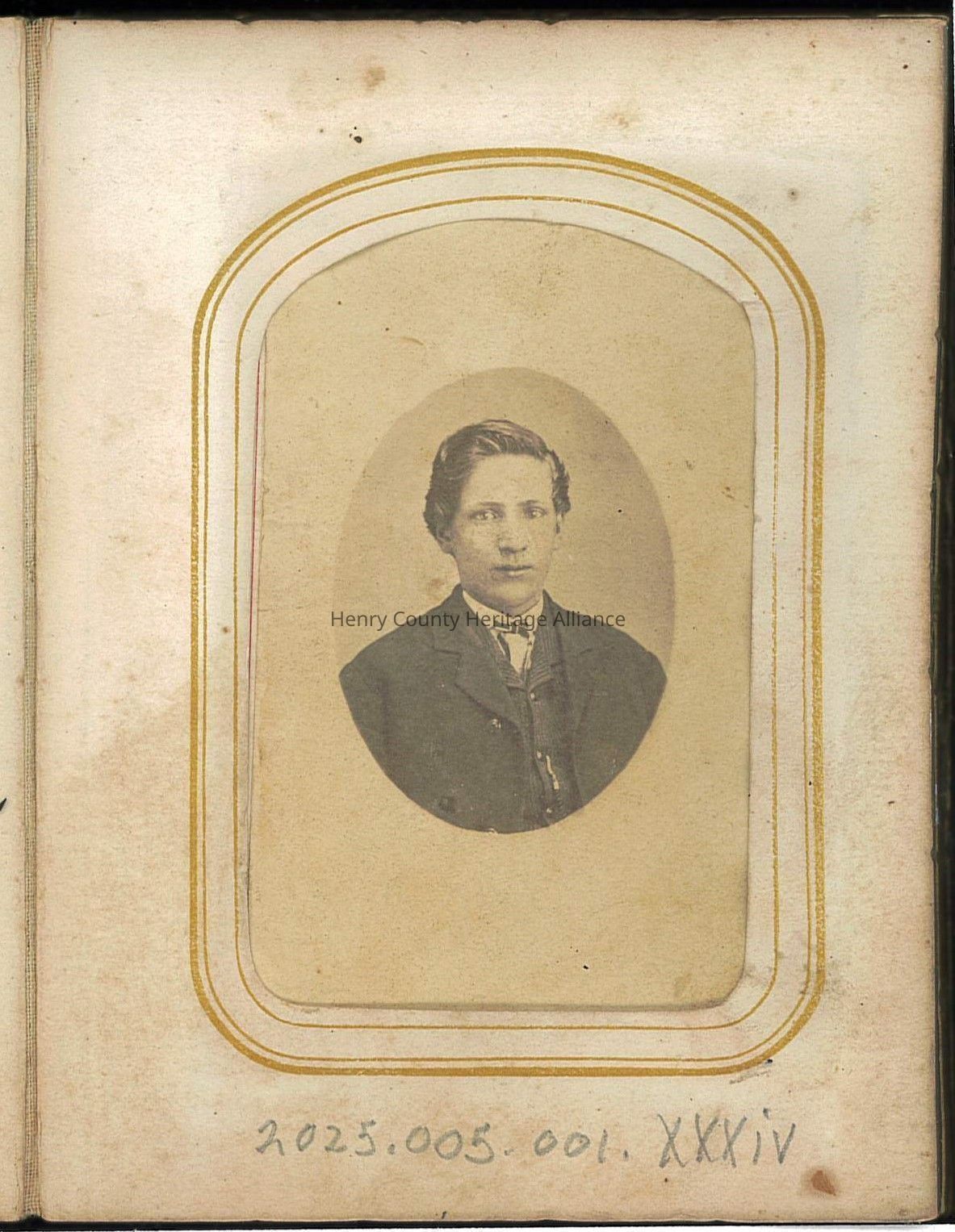 This sepia-toned photograph displays a young man dressed in formal attire, including a suit and tie, set against a plain backdrop within an oval frame.