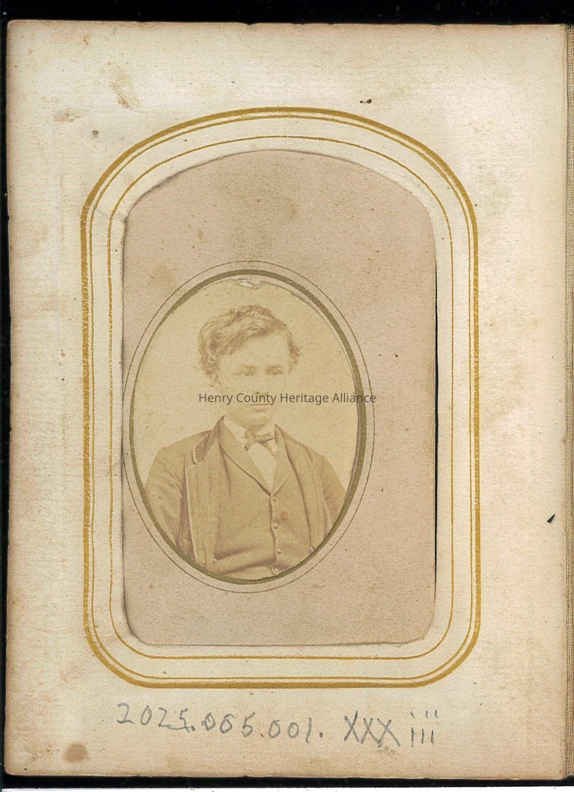 The image shows a vintage portrait of a young man wearing formal attire, enclosed in an oval frame.