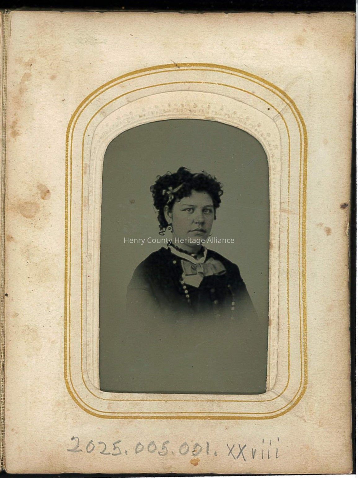 The image shows a vintage photograph of a woman with curly hair adorned with flowers, wearing a dark dress with a high-necked white collar and a ribbon tied around her neck. She is framed in an ornate, oval mat with gold detailing, suggesting an era when such portraits were cherished keepsakes.