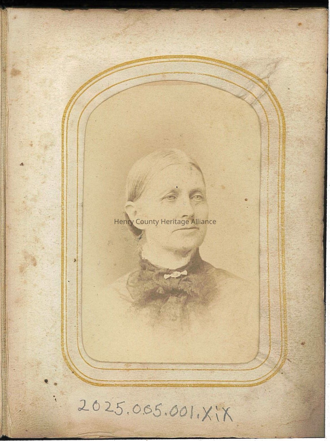 This image features an antique sepia-toned photograph of an older woman with neatly pulled-back hair, wearing a high-collared blouse with a dark ribbon tie.