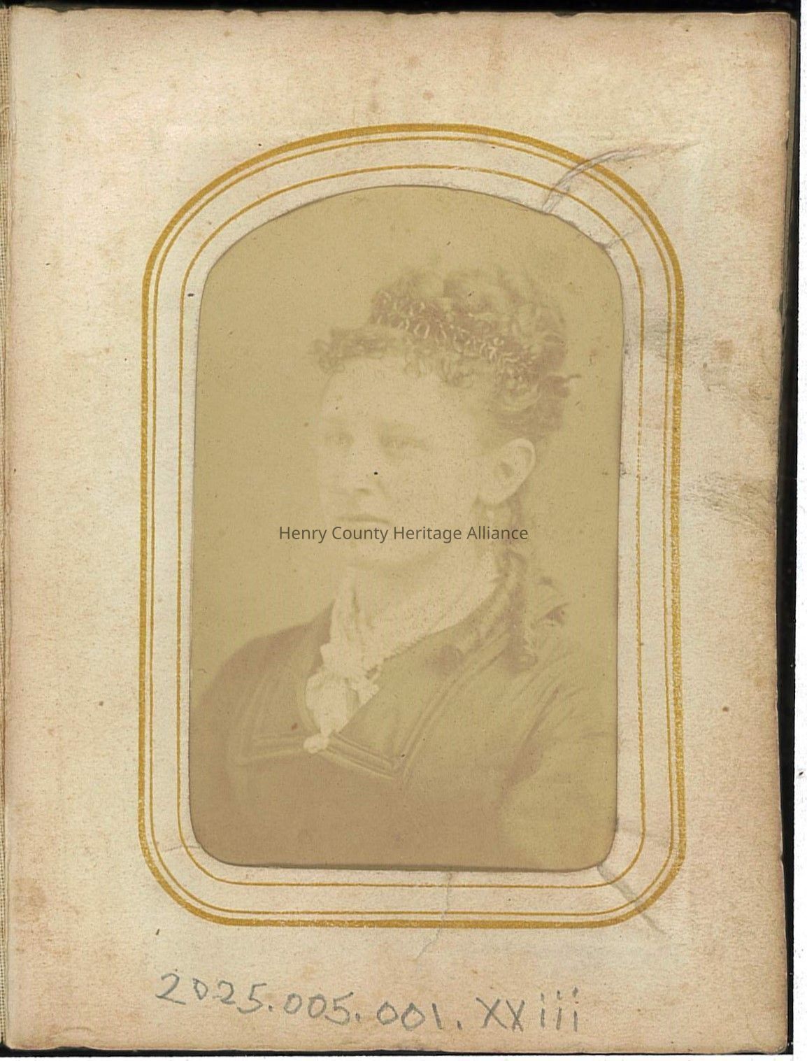 The image shows a sepia-toned portrait of a woman from the late 19th or early 20th century, featuring an oval frame with inner gold trim around the photo, which depicts her with a thoughtful expression, adorned with an elaborate hairstyle typical of the era, comprising intricate curls and braids, complemented by a high-collared garment, indicative of the fashion of the time, possibly captured in a studio setting with soft lighting, printed on aged paper that bears visible wear around the edges