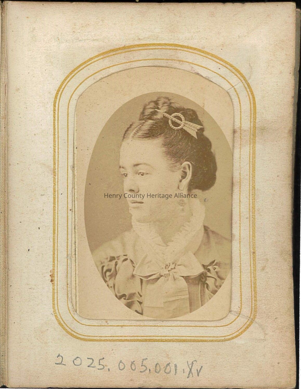 A vintage portrait shows a woman in elegant attire, with an intricate hairstyle and a gentle expression.