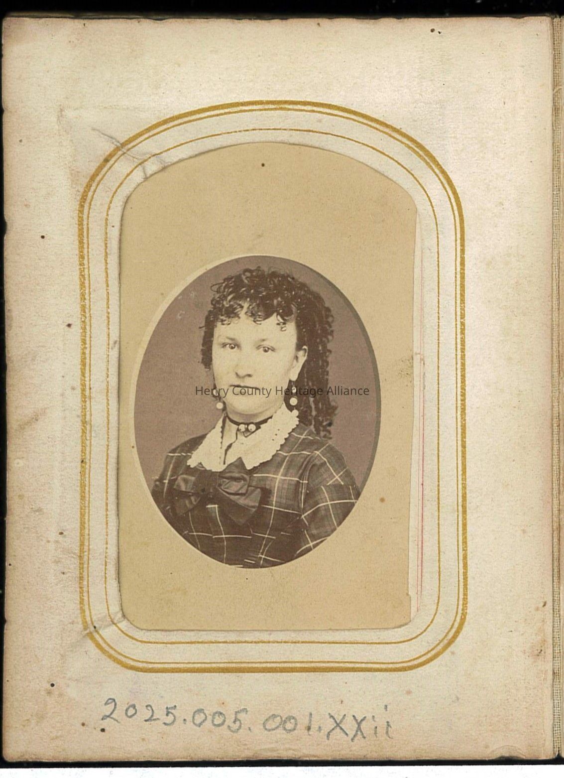 A vintage portrait shows a woman with curly hair in a plaid dress, featuring a bow and lace collar.