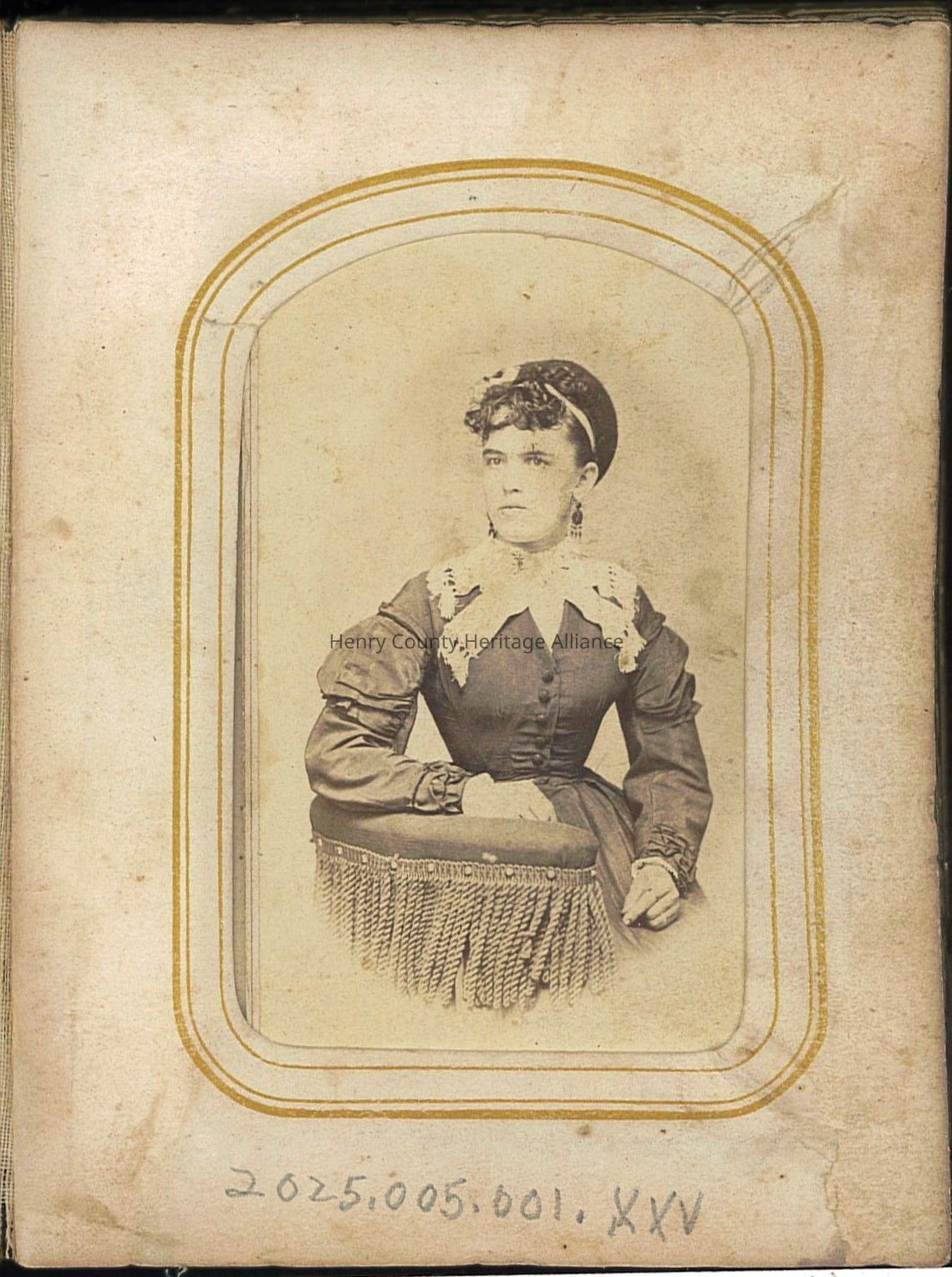 The image depicts a sepia-toned vintage photograph of a woman seated with a composed expression, dressed in a formal Victorian-era gown featuring a high collar with lace detailing, billowing sleeves, and a fitted bodice, accessorized with earrings and a decorative headpiece. The portrait is framed within an ornate border, suggesting its preservation within a period-style album or collection, evoking a sense of historical elegance and offering a glimpse into the fashion and photographic practices of the past.
