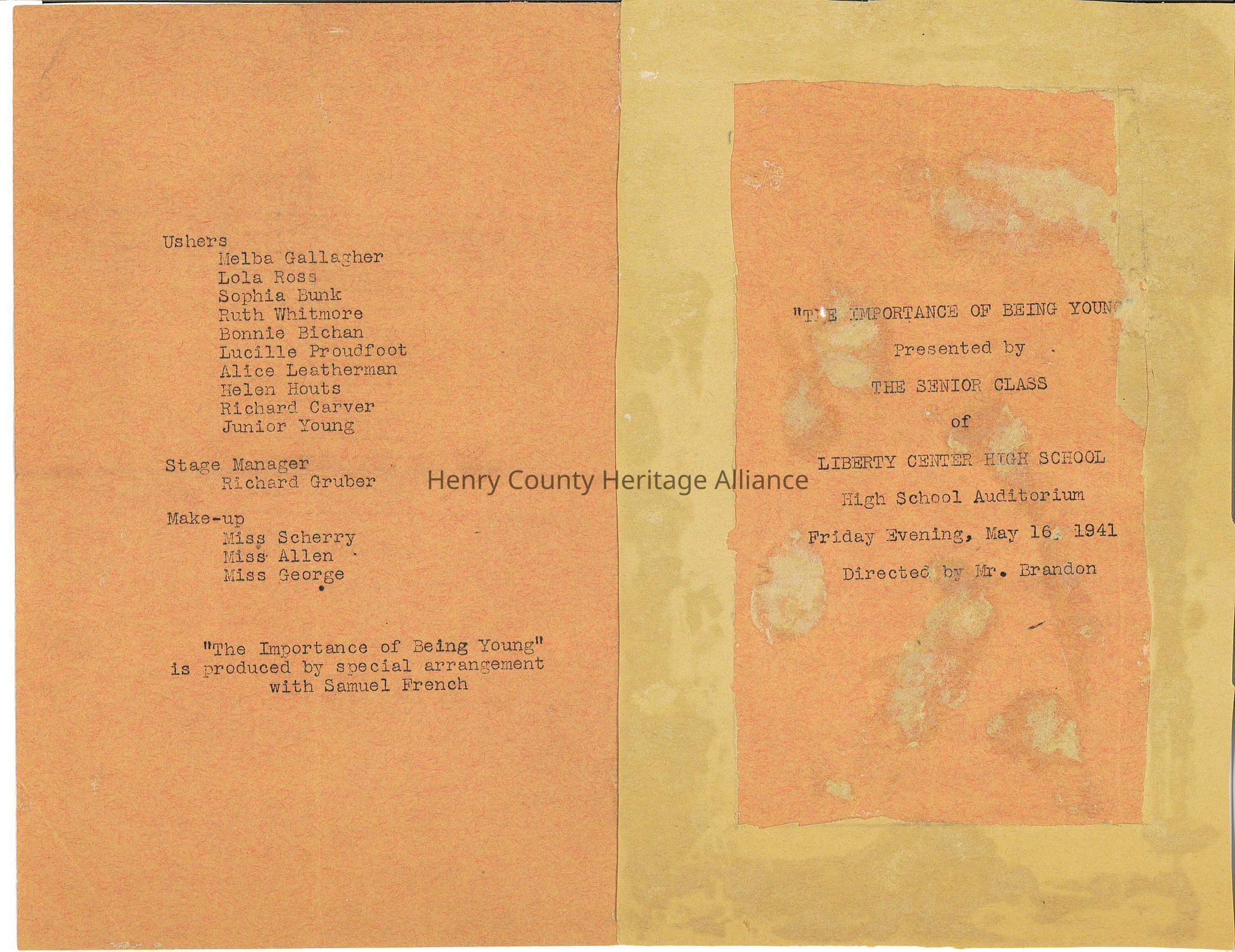 Program of The Performance of "Being Young" by Liberty Center High School Senior Class, May 10, 1941Scope and Content