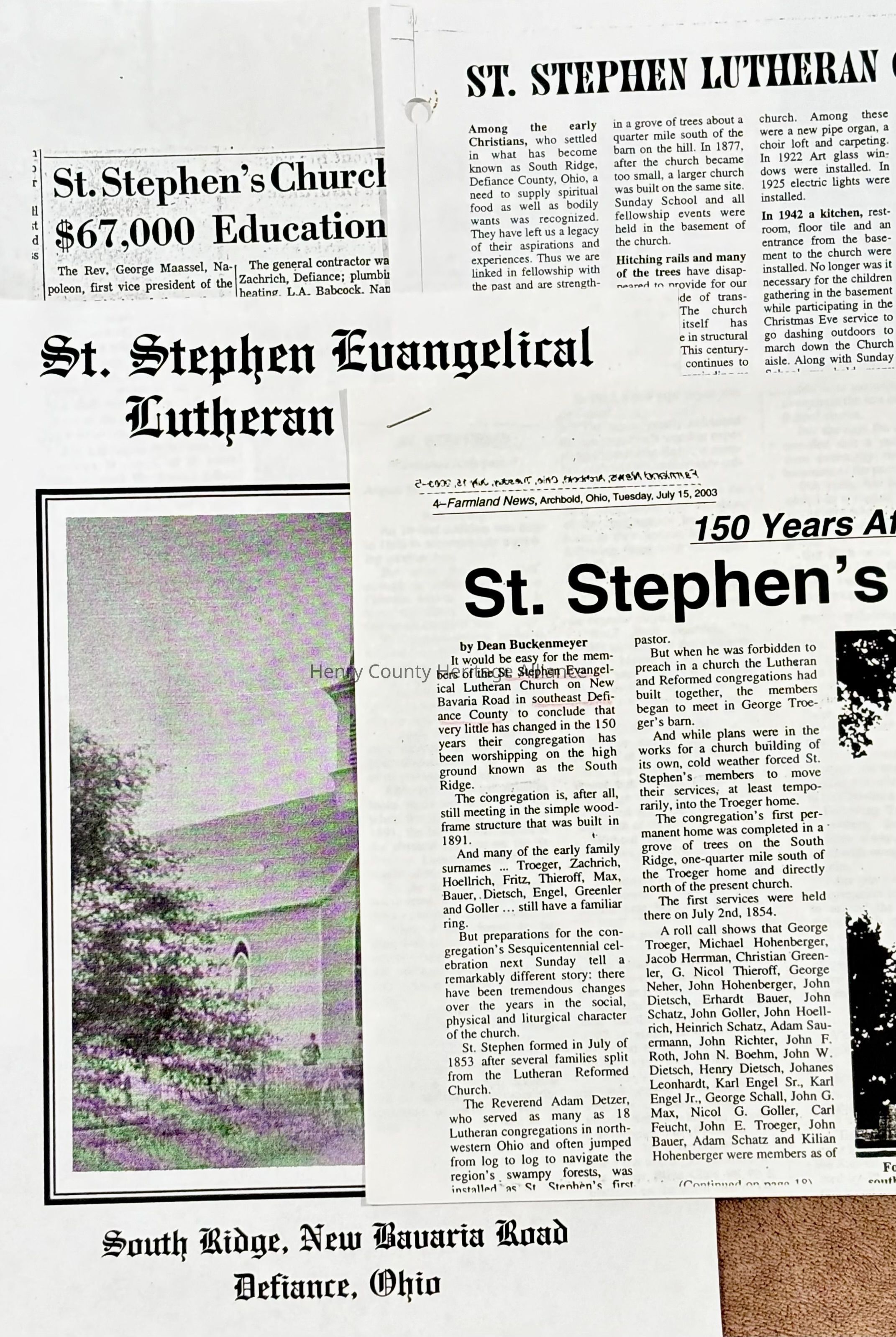 4 items South Ridge, Defiance County, Ohio - Contains various newspaper articles about the church. Church location: 30304 New Bavaria Road, Defiance, Ohio