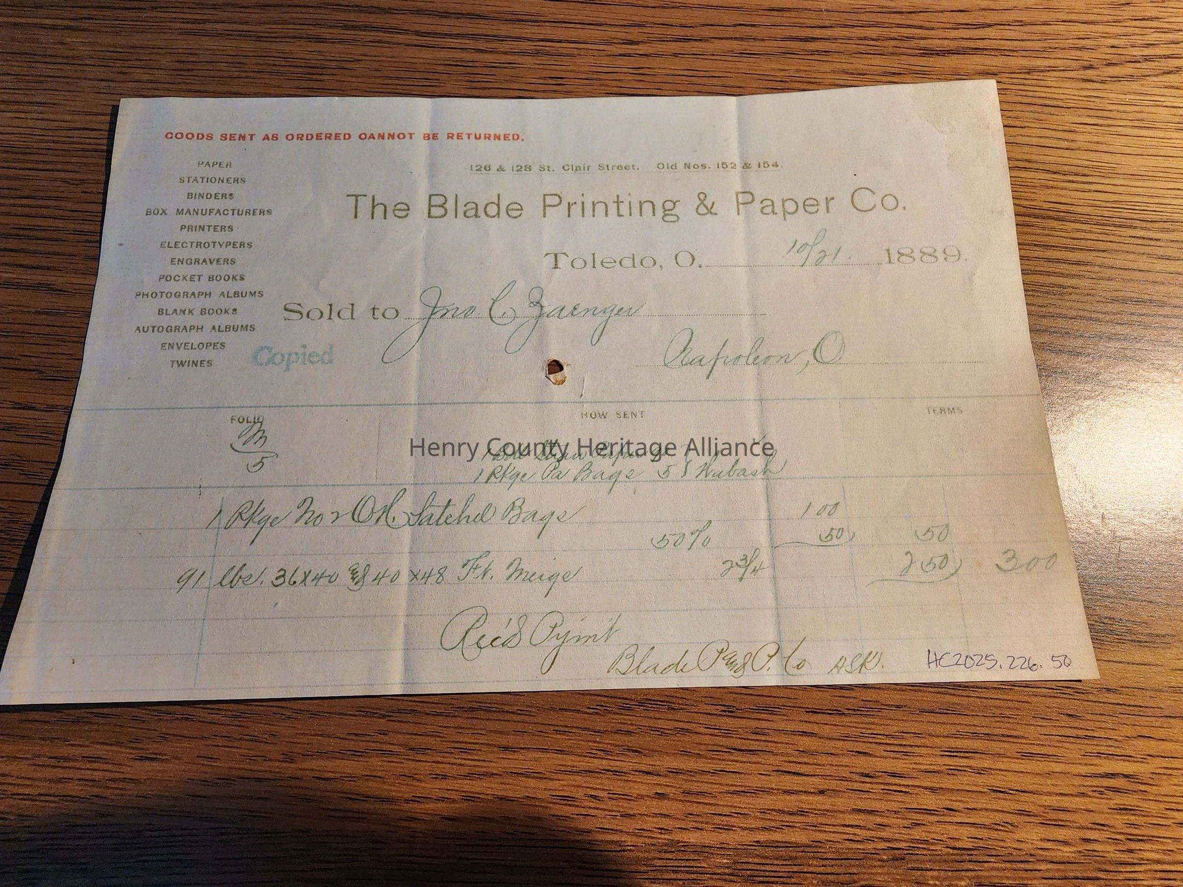 The Blade Printing & Paper Co, Receipt 1889
