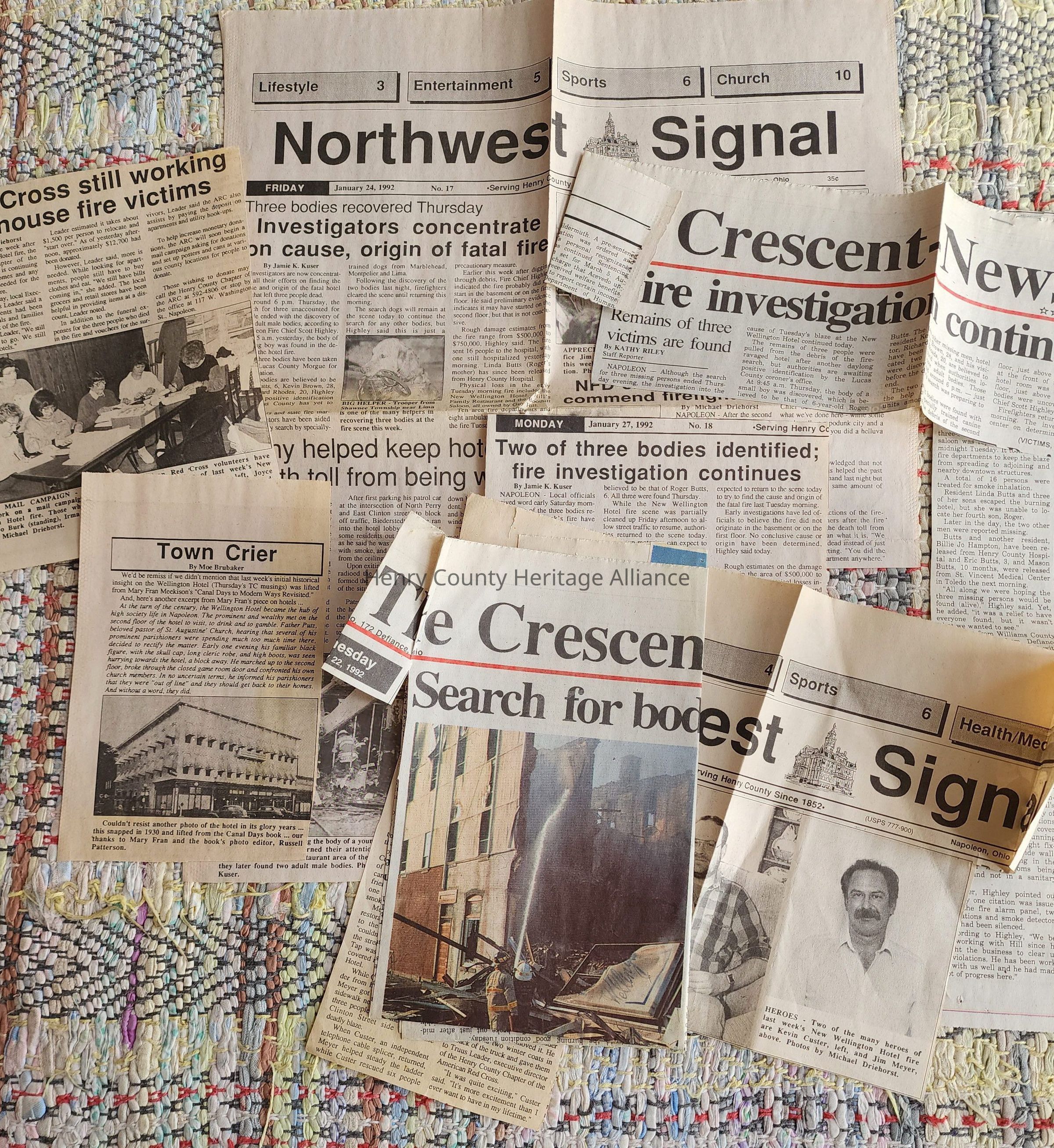 Many Newspaper Clippings pertaining to the Fire at the Wellington Hotel, Downtown Napoleon, Ohio, 1992.