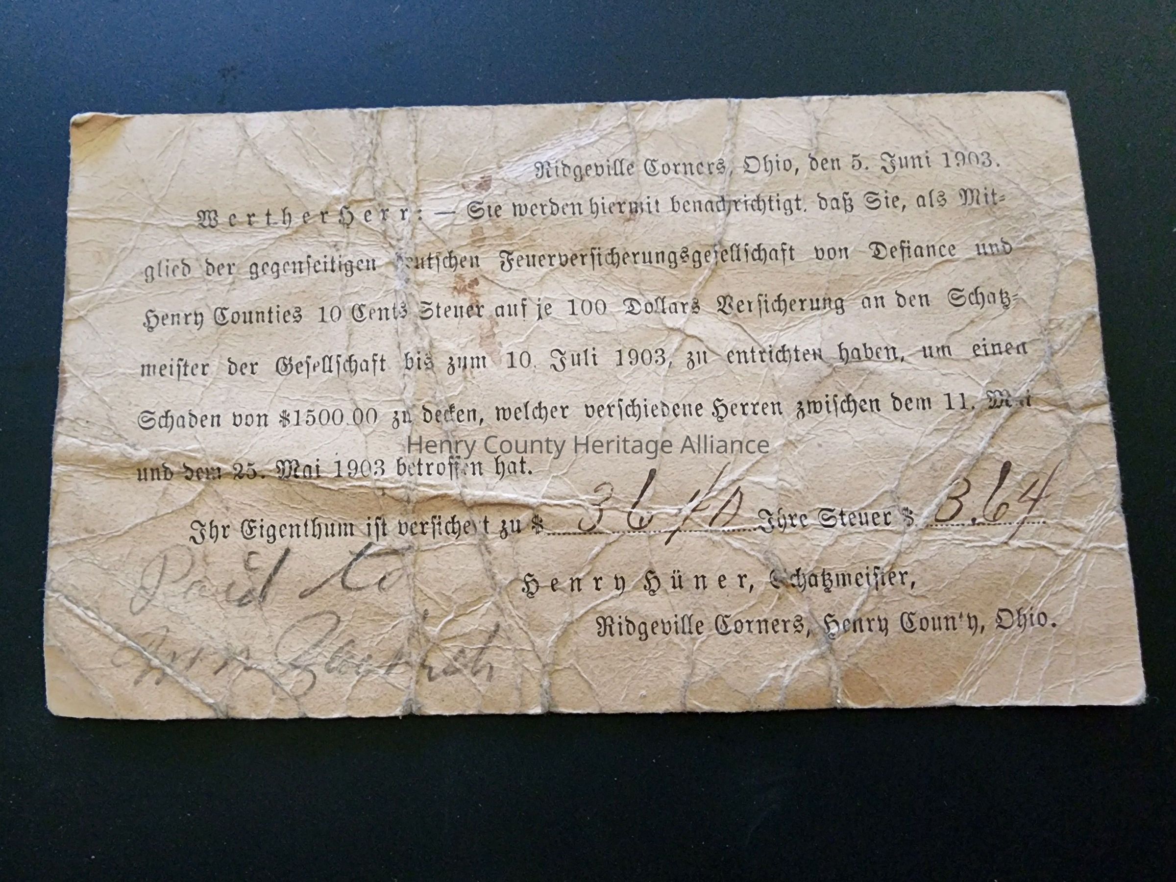 W.F.Wolf, Pleasant Bend, Ohio Postcard from Insurance Co Re: Claim German