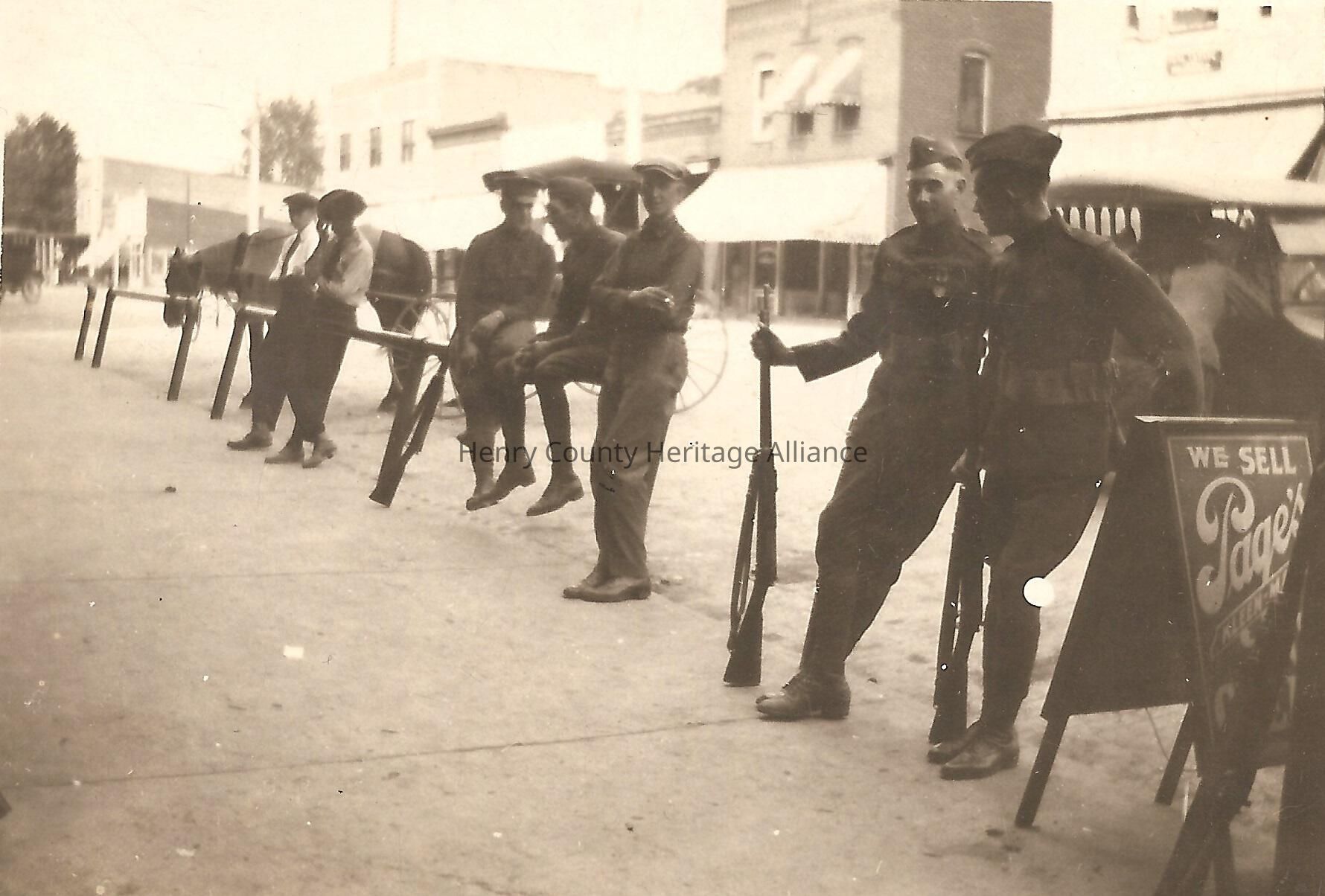In the sepia-toned image, a group of veterans are seen casually leaning against and sitting on iron hitching posts along East Street in Liberty Center, OH, with several of them holding rifles; they are dressed in WWI clothing, including military-style uniforms and flat caps, and are positioned in front of a backdrop consisting of the east side of East Street and horse-drawn carriages, giving the scene a historical feel, while the signboard on the right reads "We Sell Page's Ice Cream." possibly referring to a store or product from that era.