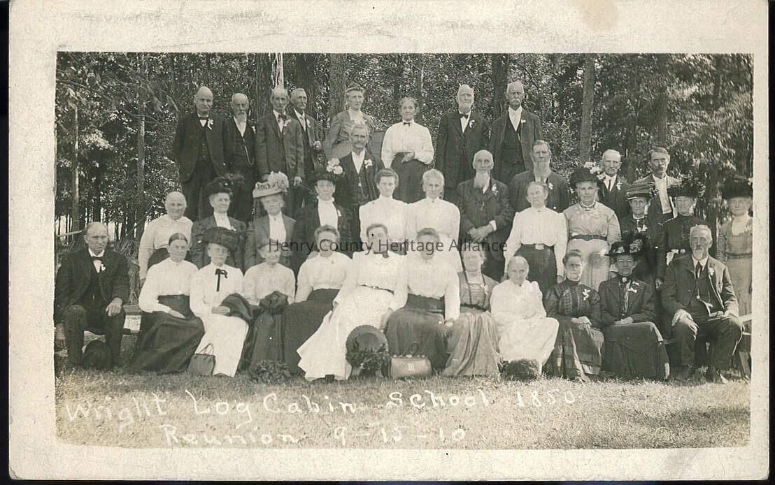 This 1910 black and white photograph captures a group portrait of approximately 36 individuals, both men and women, who are gathered for the Wright Log Cabin School 60th reunion of 1850 students, as indicated by the text at the bottom of the image; they are dressed in formal attire typical of the 19th century, with the women wearing high-collared blouses and long skirts, and the men in suits and ties, some with boutonnières, sitting and standing in three rows against a backdrop of tall trees, possibly at Showman's Point along the Maumee River, providing a glimpse into the historical fashion and communal gatherings of that era.