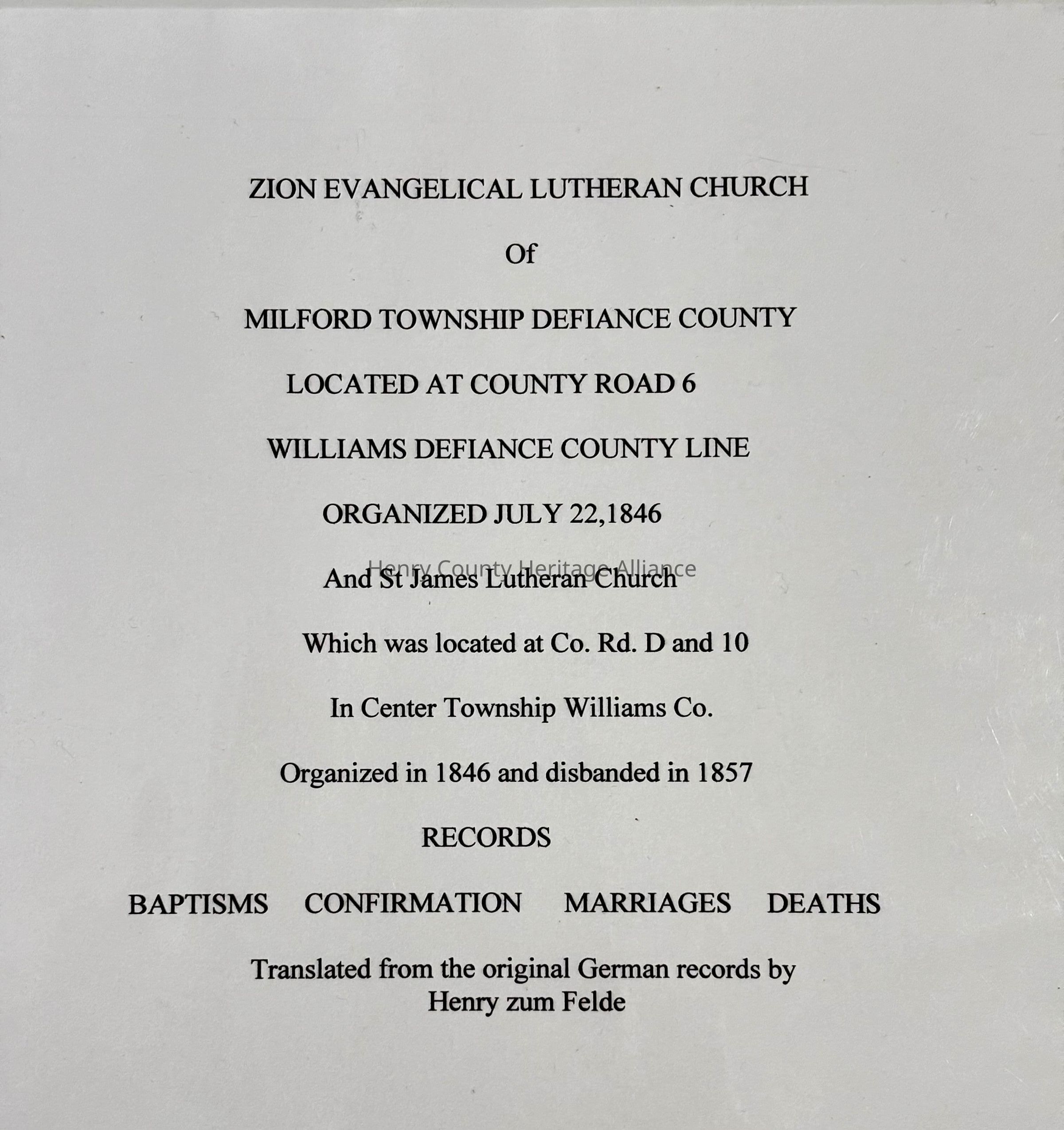 56 pages Milford Township, Defiance County, Ohio - Church records consisting of: Baptism (1845 - 1889) Confirmation (1846 - 1862) Marriage (1846 - 1888) Burials (1846 - abt 1886) Located at Cicero Road on Williams-Defiance County Line Also includes records from St. James Lutheran Church Located at Co. Rd. D and 10 in Center Twp., Williams County, Ohio