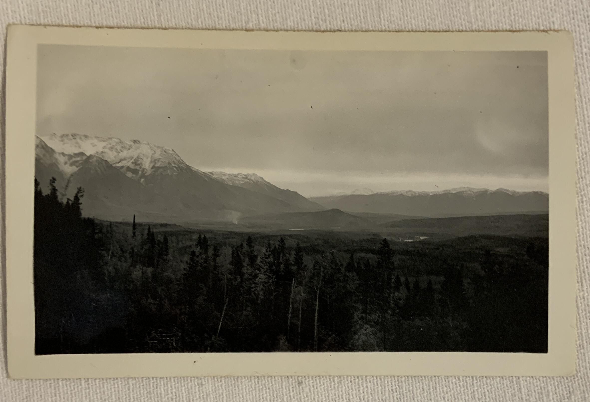 Looking south west from Forestry Lookout, Smoke in center is train at South Hazelton Station, Hazelton, October 1943Acquisition
