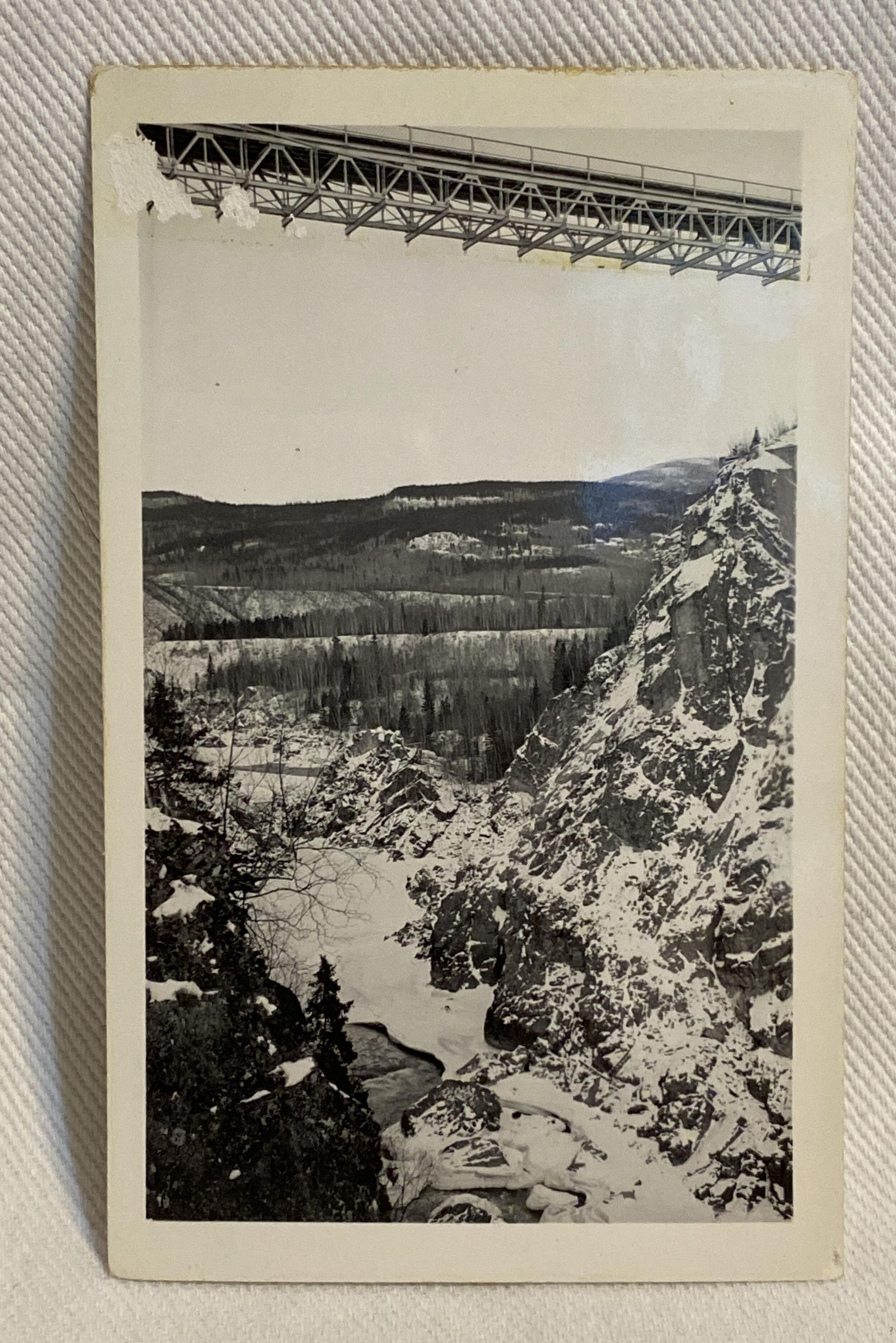 Looking up Hagwilget Canyon from rocks below Indian Fish Smoke Houses, Hazelton, January 1943Photograph Details
