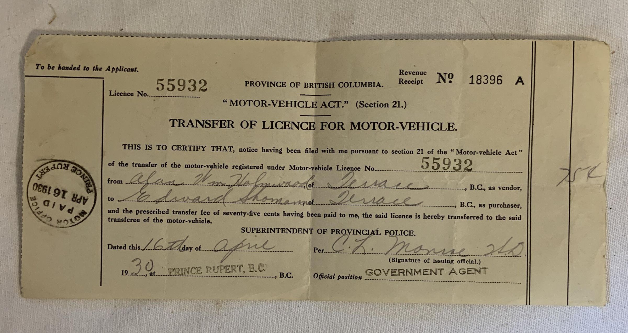 1930 Transfer of Motor Vehicle LicenseEntry/Object ID