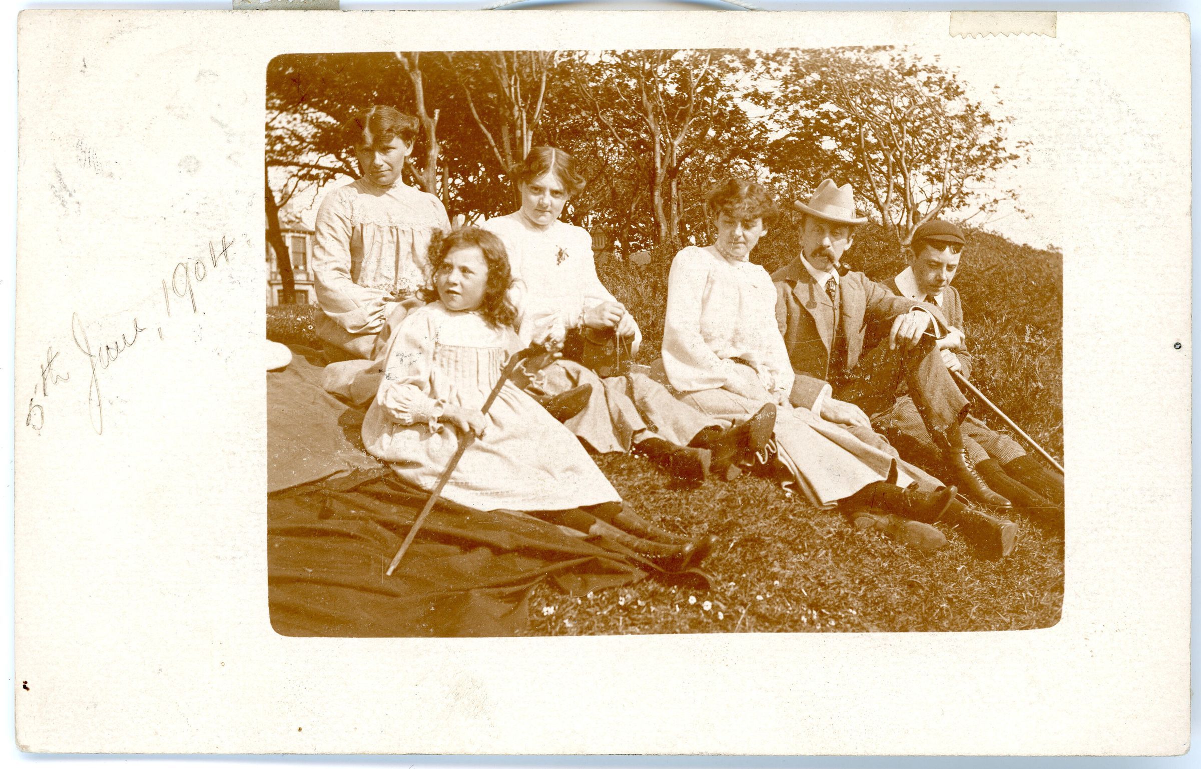 Postcard from 1904 of 5 adults sitting on a grass hill with one little girlCollection