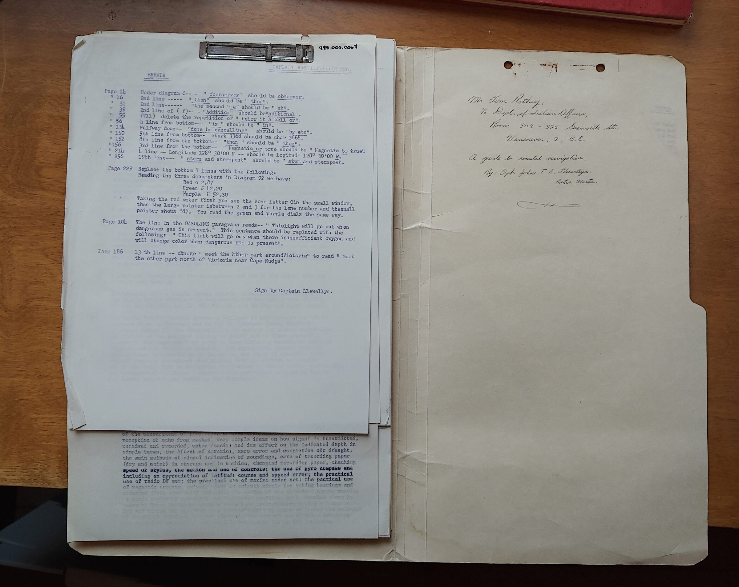 Inscription on inside of cover: "Mr. Tom Rothery, % Dept. of Indian Affairs, Room 303-325 Granville St., Vancouver, 2, B.C."