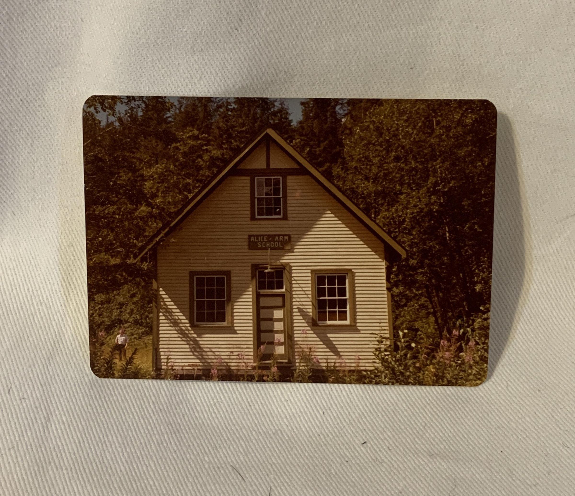 written on back 'Across Alice Arm an inlet of Observatory Inlet off Potland Inlet northeast of Terrace N3 Kitsault Elemtary school opened 1981 across Alice Arm from the old Alice Arm closed 1983Acquisition