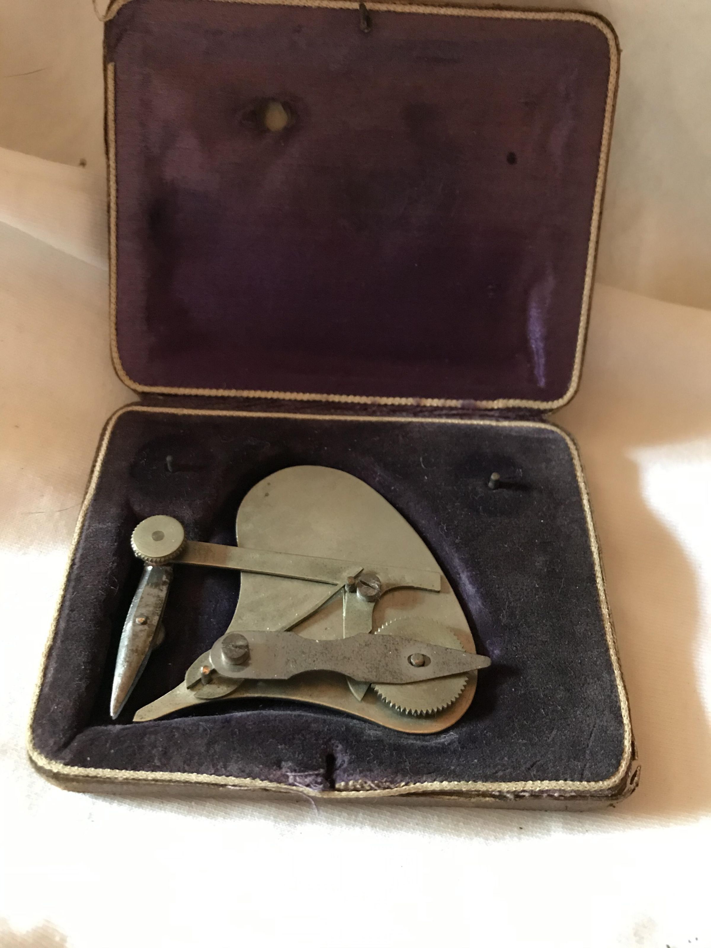 Black case with purple lining and instrument for use with ruler