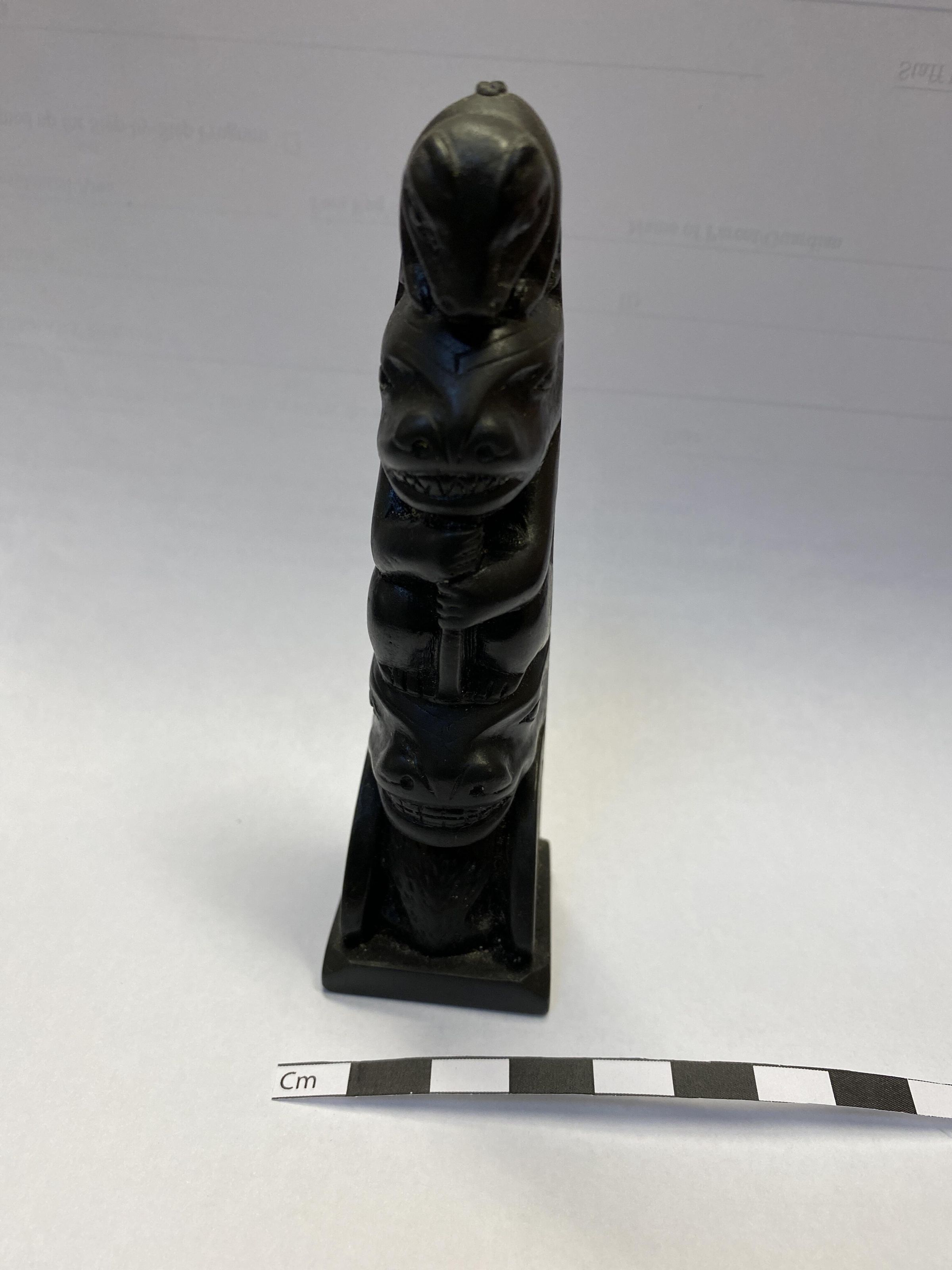 Small black argylite carved totem. Imaging is of three animals stacked. Top depicts animal with badger like face followed by and animal standing holding something this animal has an open mouth and pointed teeth. Bottom animal is possibly a seal as it has fur but also what appear to be fins on either side. Back of totem is completely flat, as is bottom. Etched into the base is “BC”Cataloged By