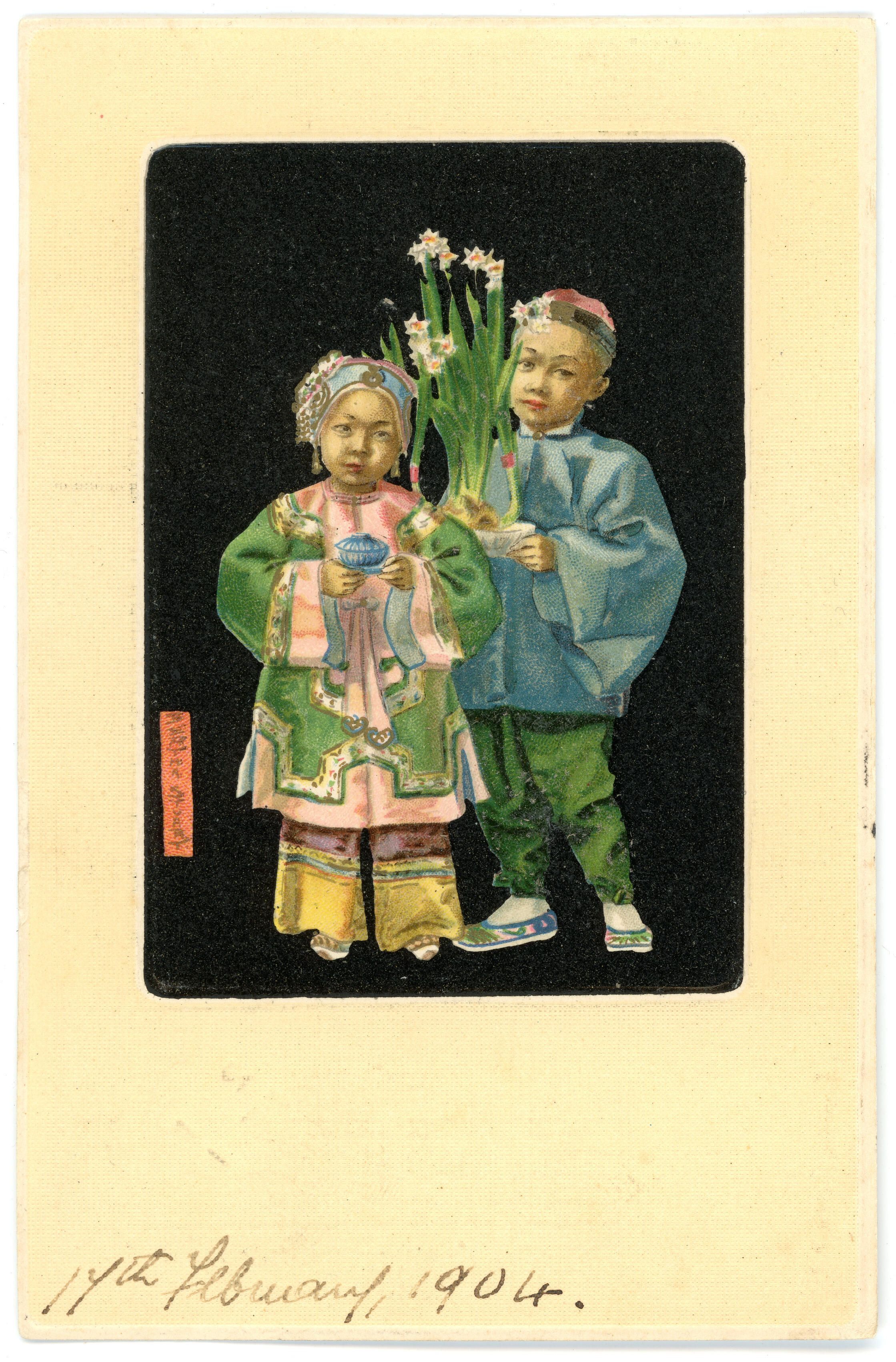 Postcard from 1904 of a traditionally dress Oriental couple, with the man holding flowersCollection