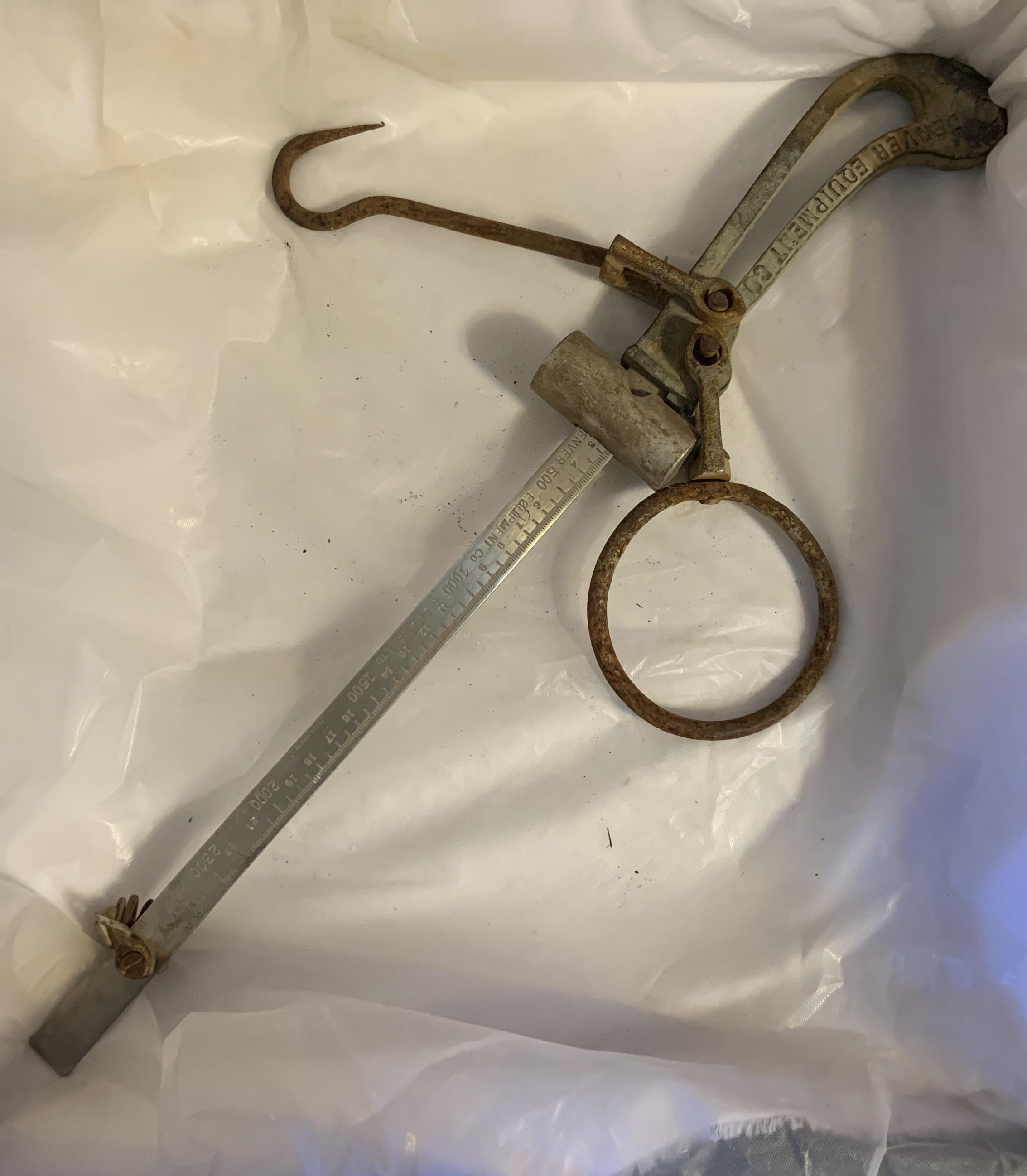 Metal Assayers scale. Units in grams, goes from 500 to 2300. Two parts: unit ruler attached to a ring and a hook.Use