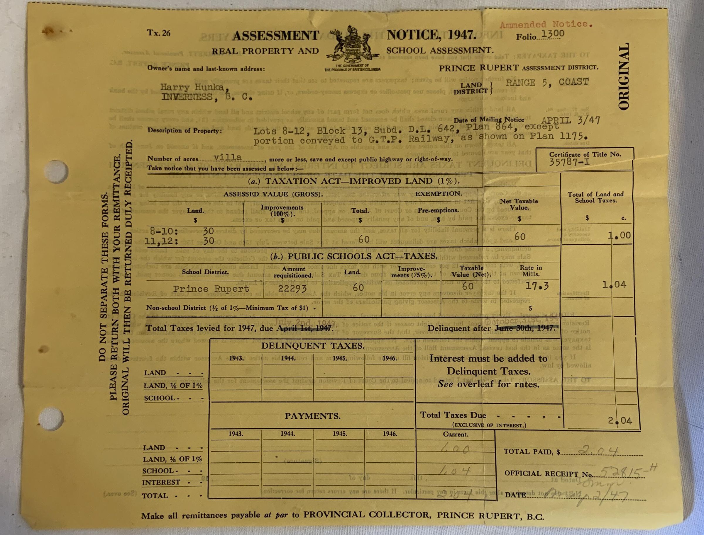 'Assessment Notice 1947'Entry/Object ID