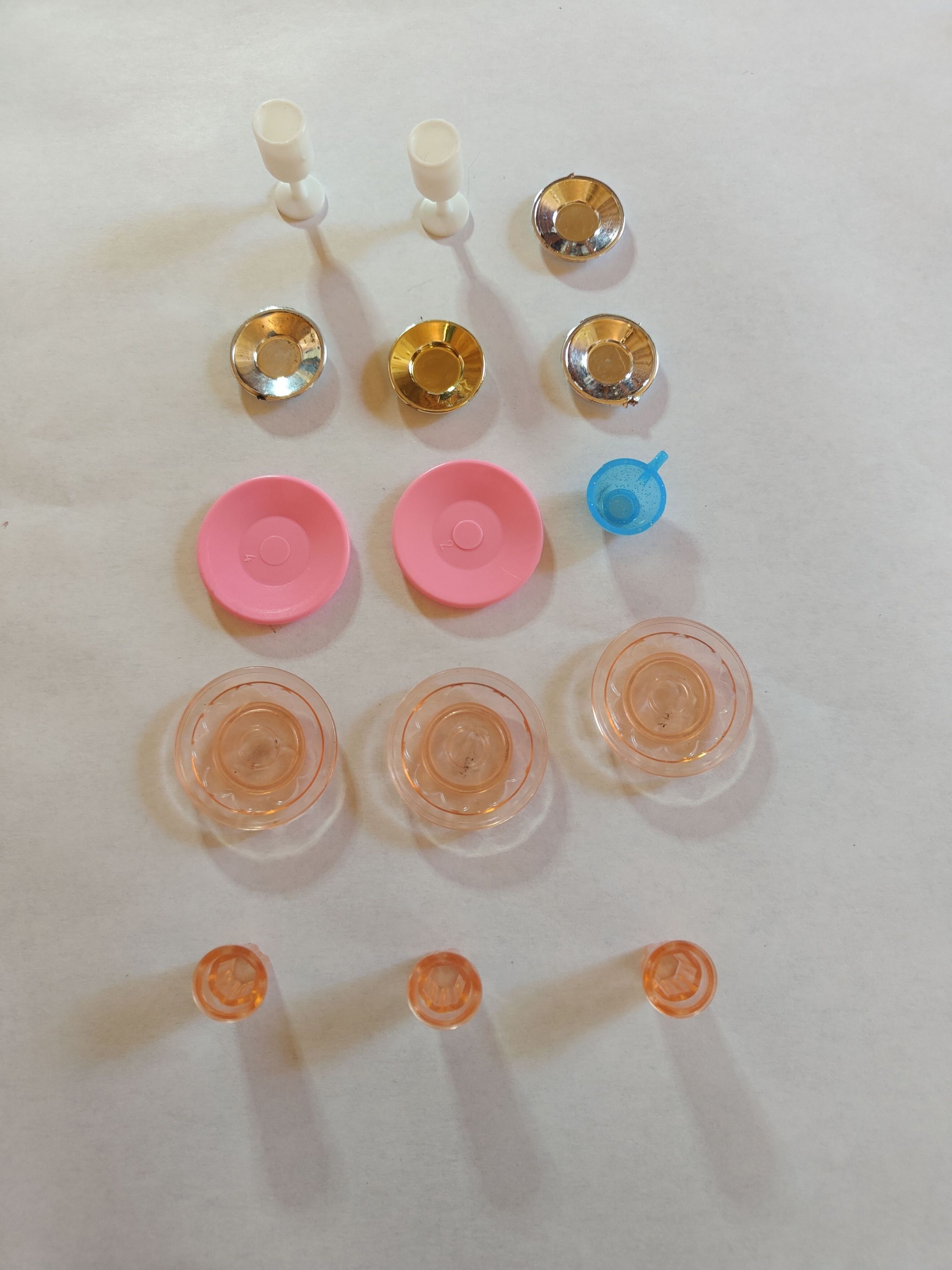 An assortment of cups and plates from a Barbie dollhouse.
