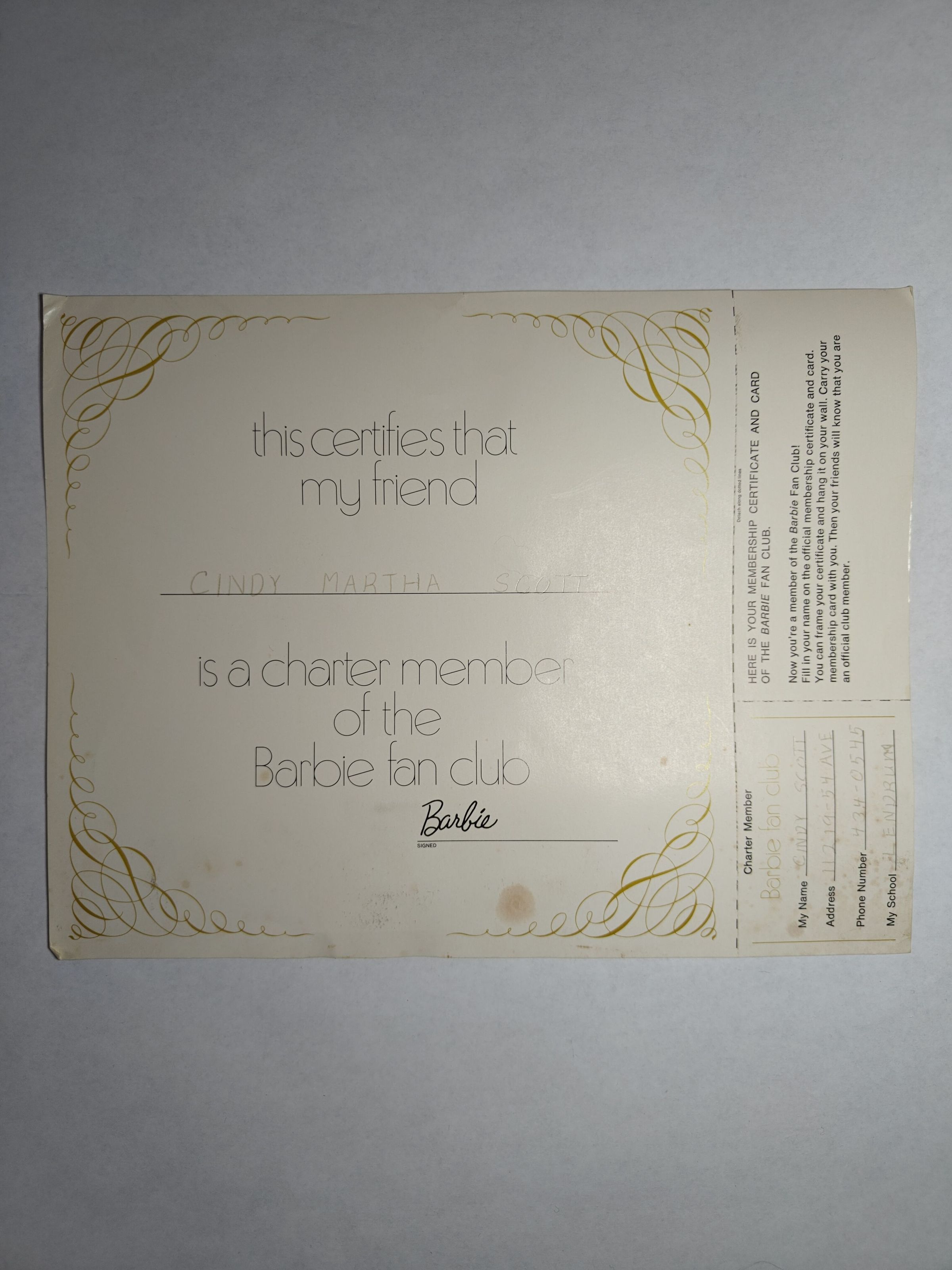 Barbie fan club certificate and membership card.Cataloged By