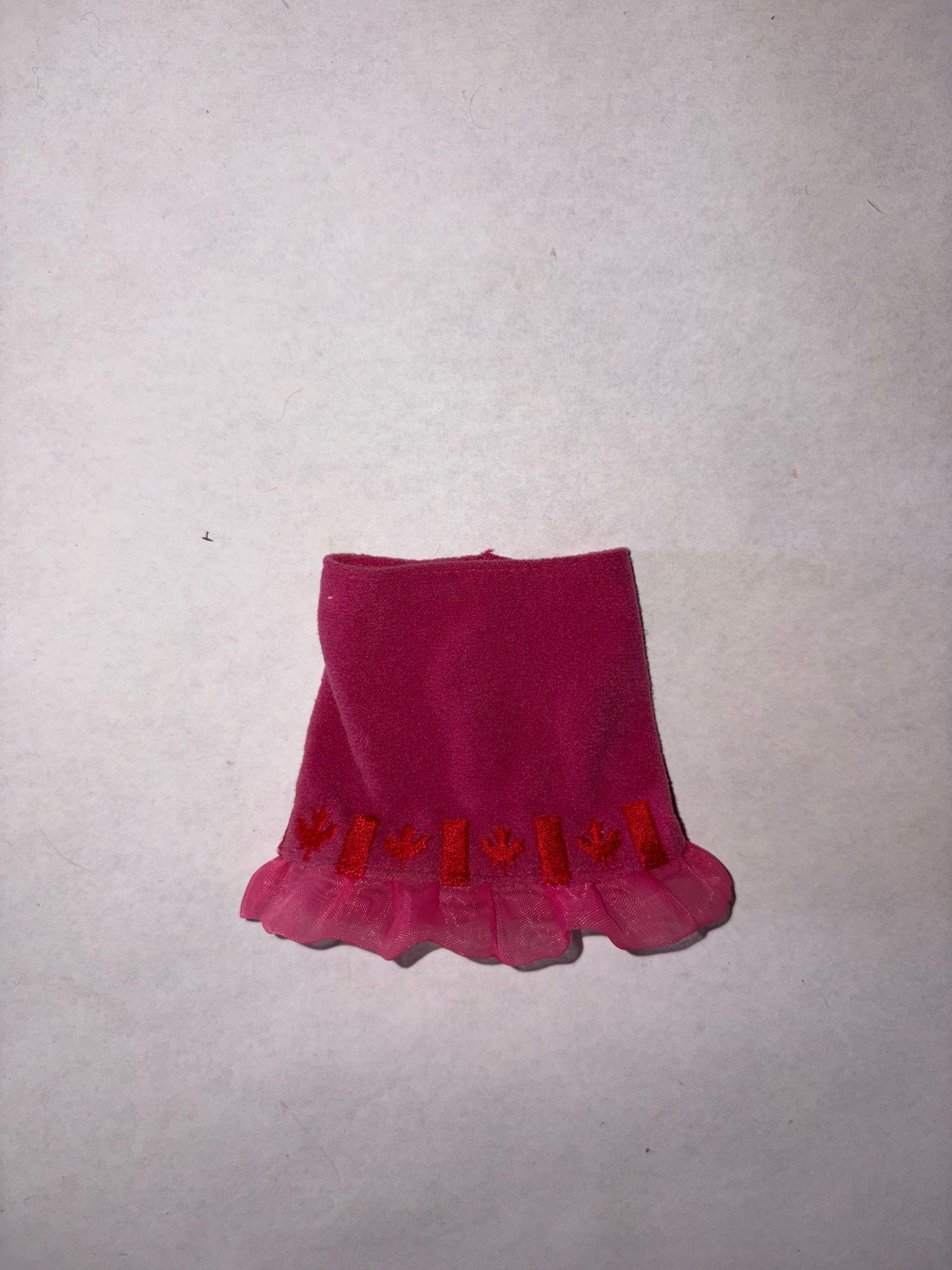 Pink ruffle skirt for Barbie’s with Canadian flags on it.Context